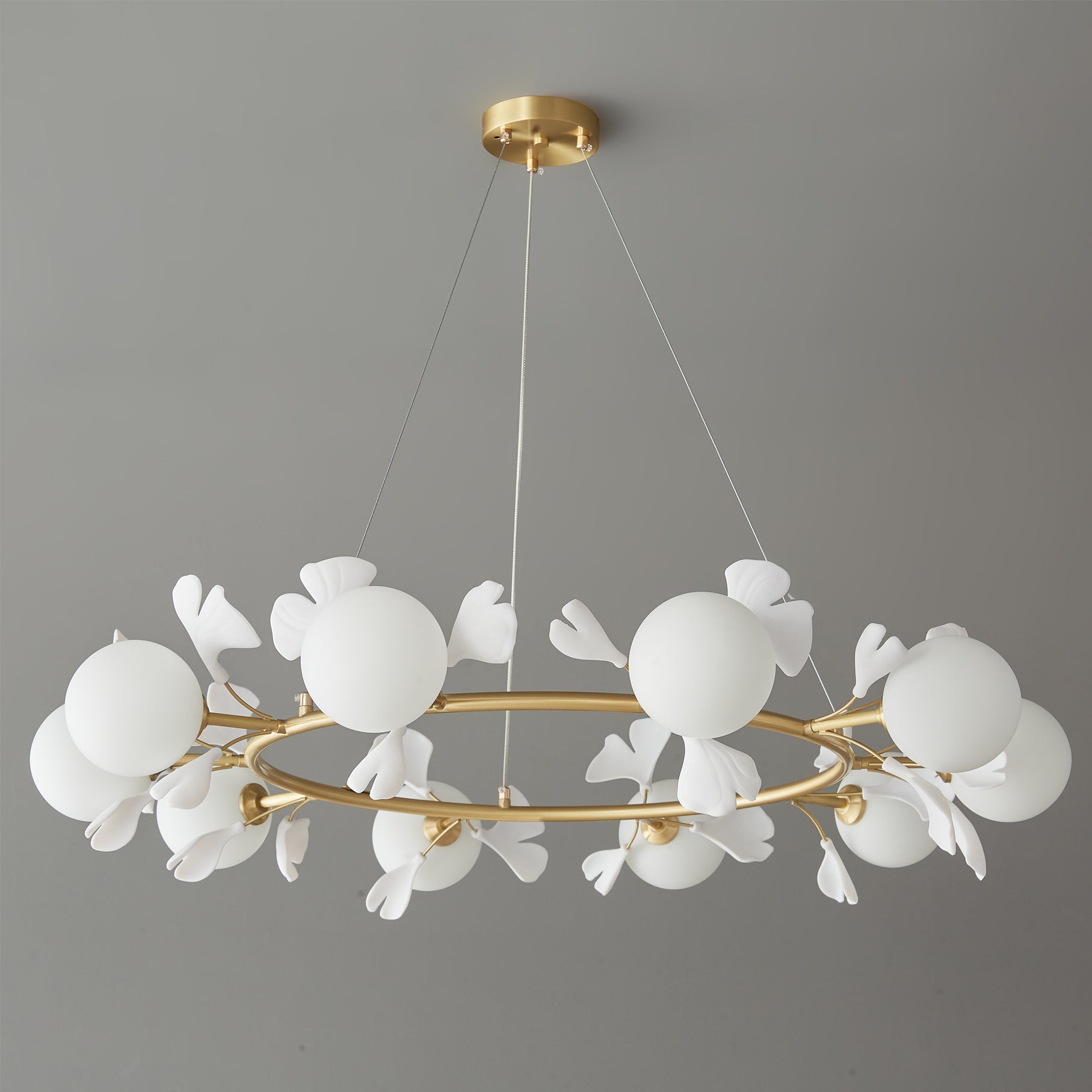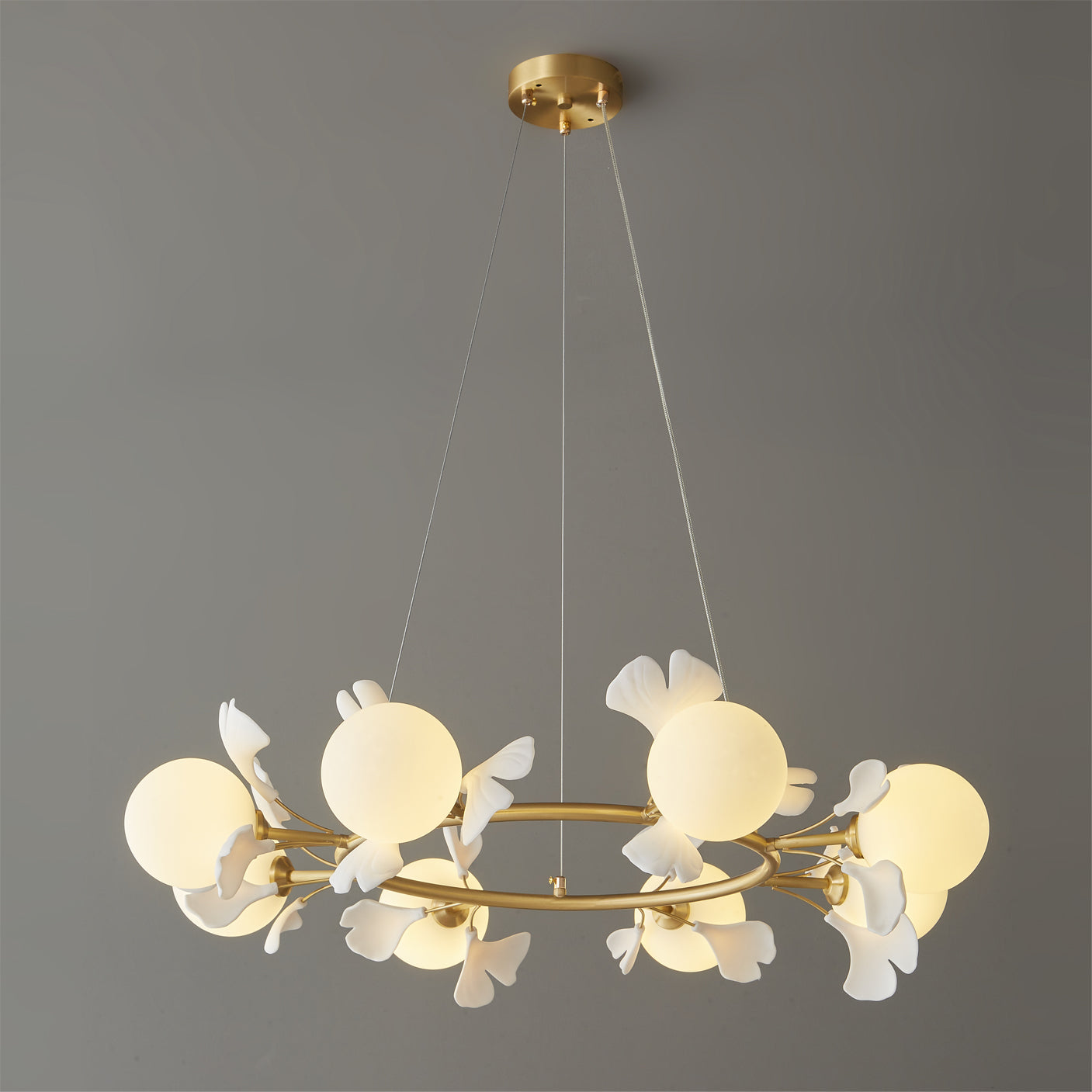 This stunning chandelier features a unique gingko leaf design, adding a touch of elegance and nature to any space. With its round shape, it provides even distribution of light, creating a warm and inviting atmosphere. Elevate your home decor with this timeless piece.