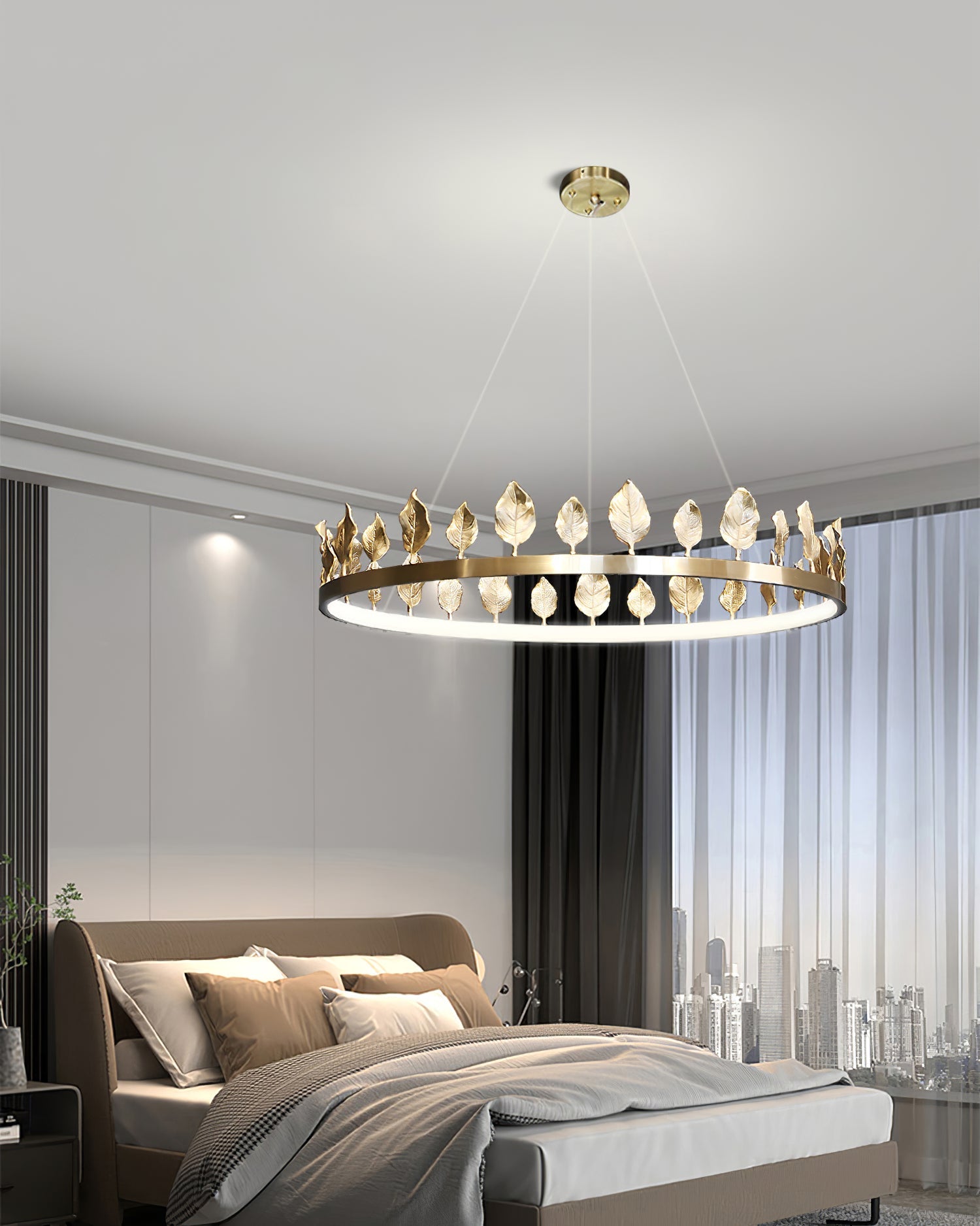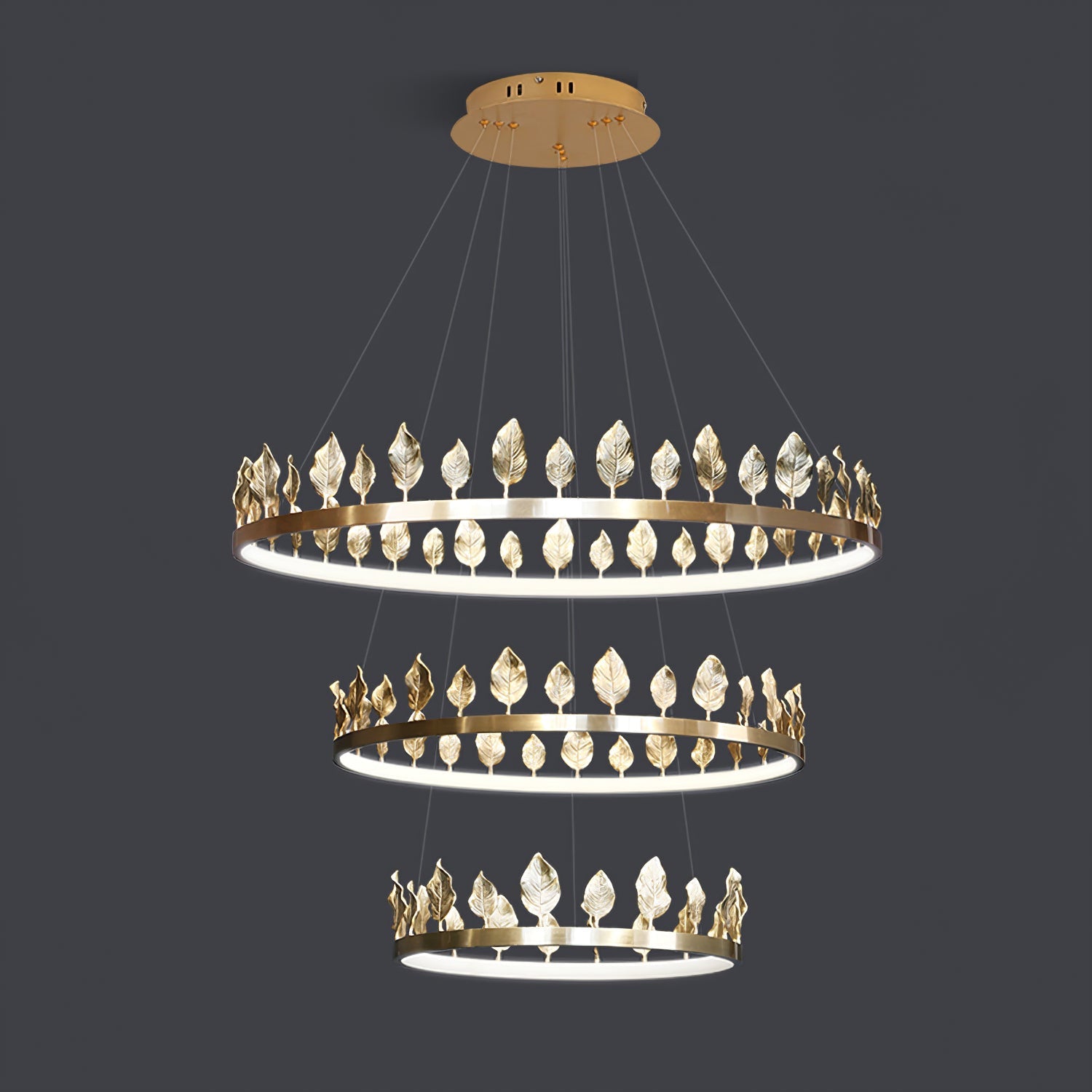 Our Anello Chandelier is shaped like a crown made of laurel leaves. The design is brilliant in a mix of contemporary gold leaf and painted gold finishes. Because the leaves are hand-applied, slight variations in shape may exist on this gold chandelier.