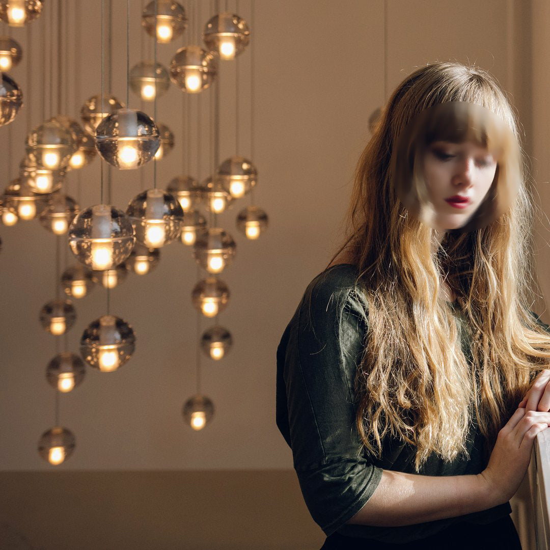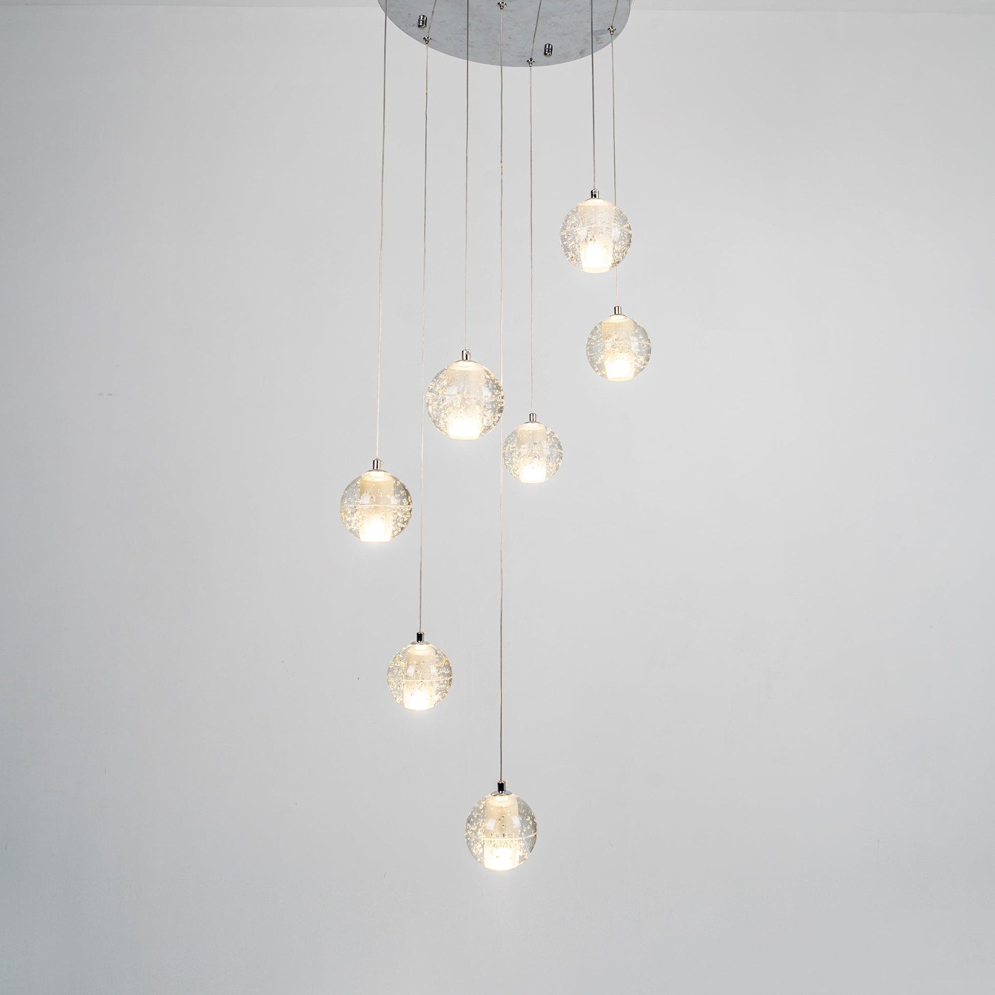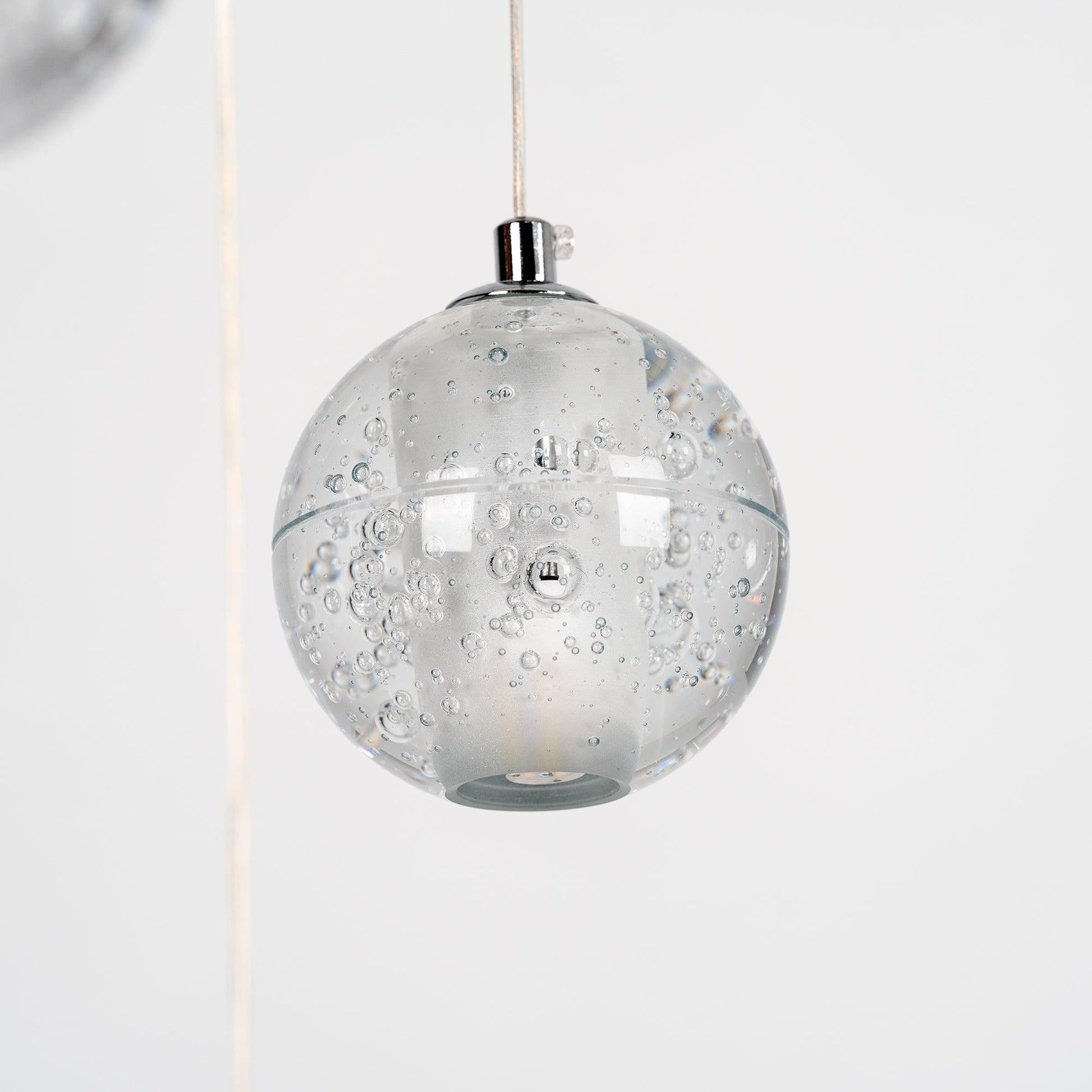 This gorgeous pendant pairs beautiful clear glass globes with a gorgeous soft subtle display of light. This pendant can be multiplied and set up in a cluster creating a floating glass ball effect. The Crystal pendant lamp interacts with the imperfections of the glass to create a rich halo of light. Visually quite subtle, they gain tremendous strength when clustered in random formations along horizontal and vertical applications.