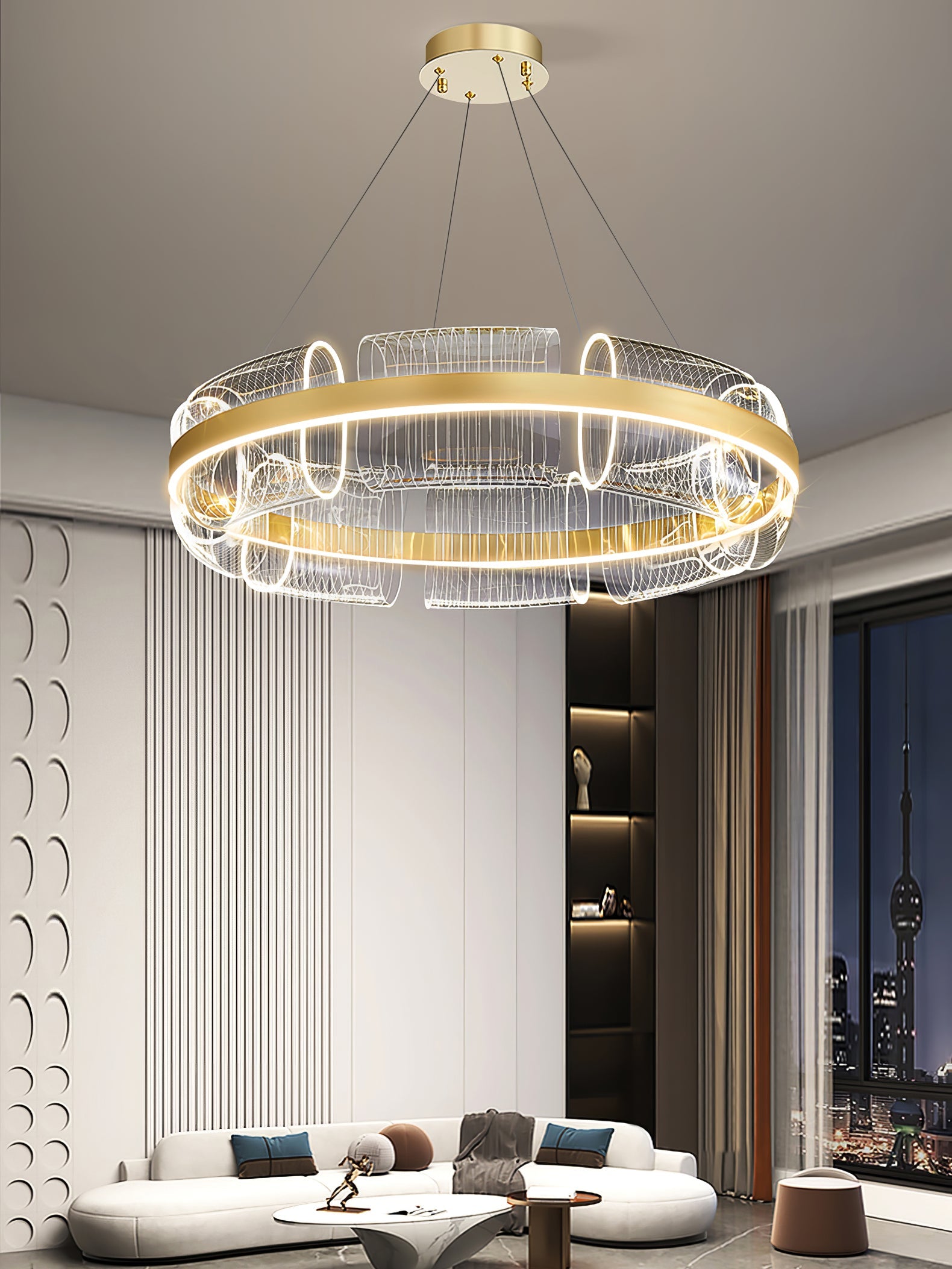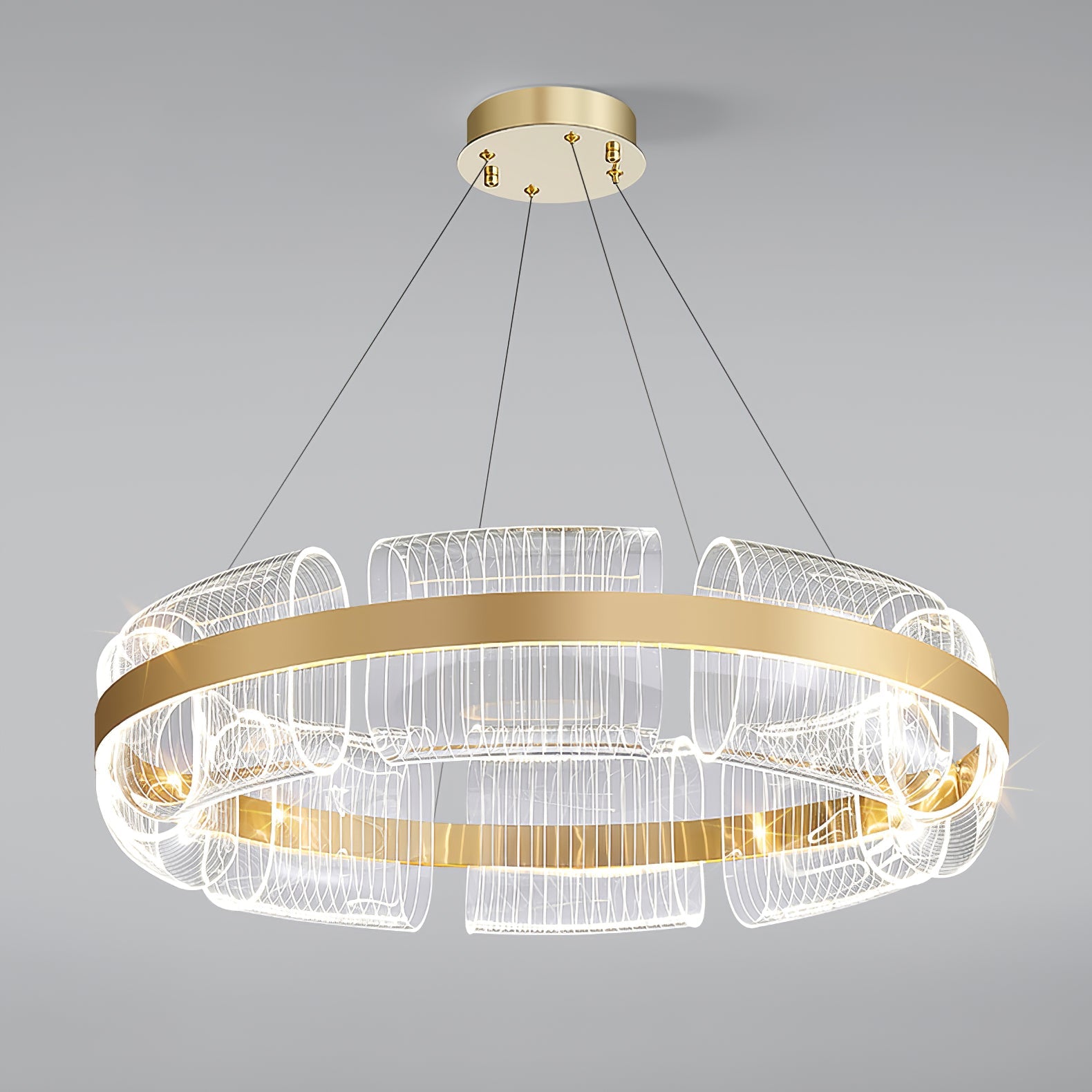 This LED chandelier is in a gold finish. The frame is made out of metal in a halo ring shape. The LED Acrylic is integrated into the frame. The adjustable cord links make this fixture suitable for most ceiling heights.