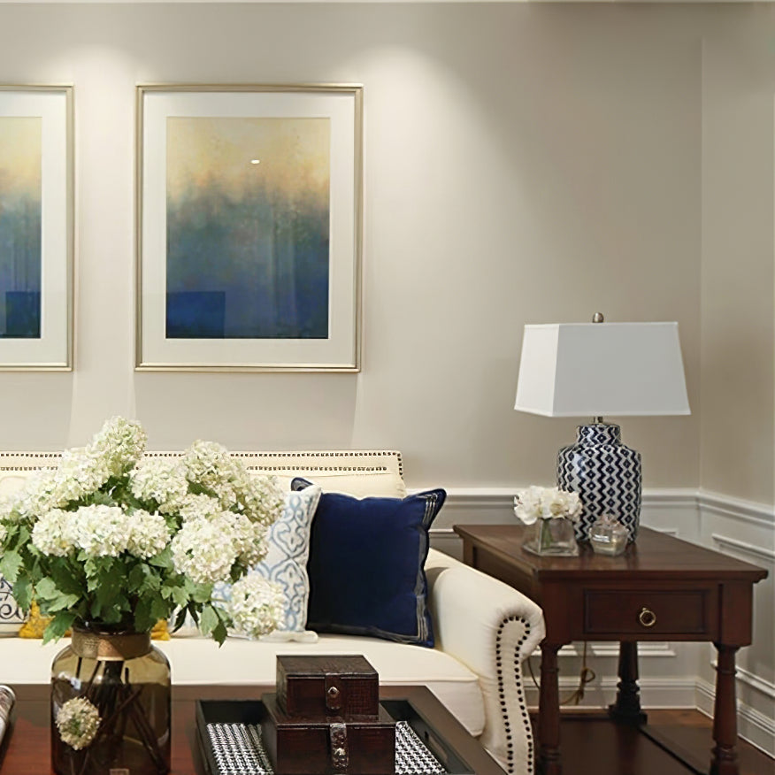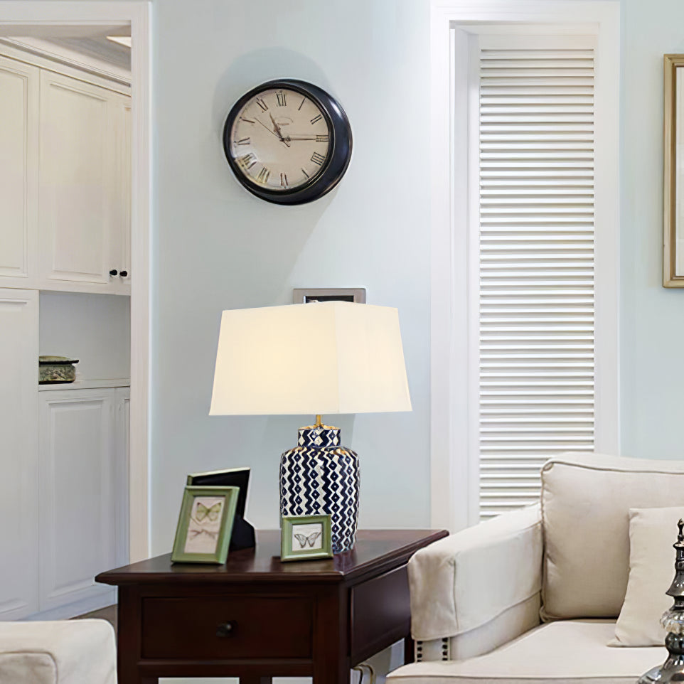 Classic blue and white porcelain lamp with modern geometric design, satin nickel accents and white drum shade finish this beautiful lamp.Perfect for the corner of the living room.