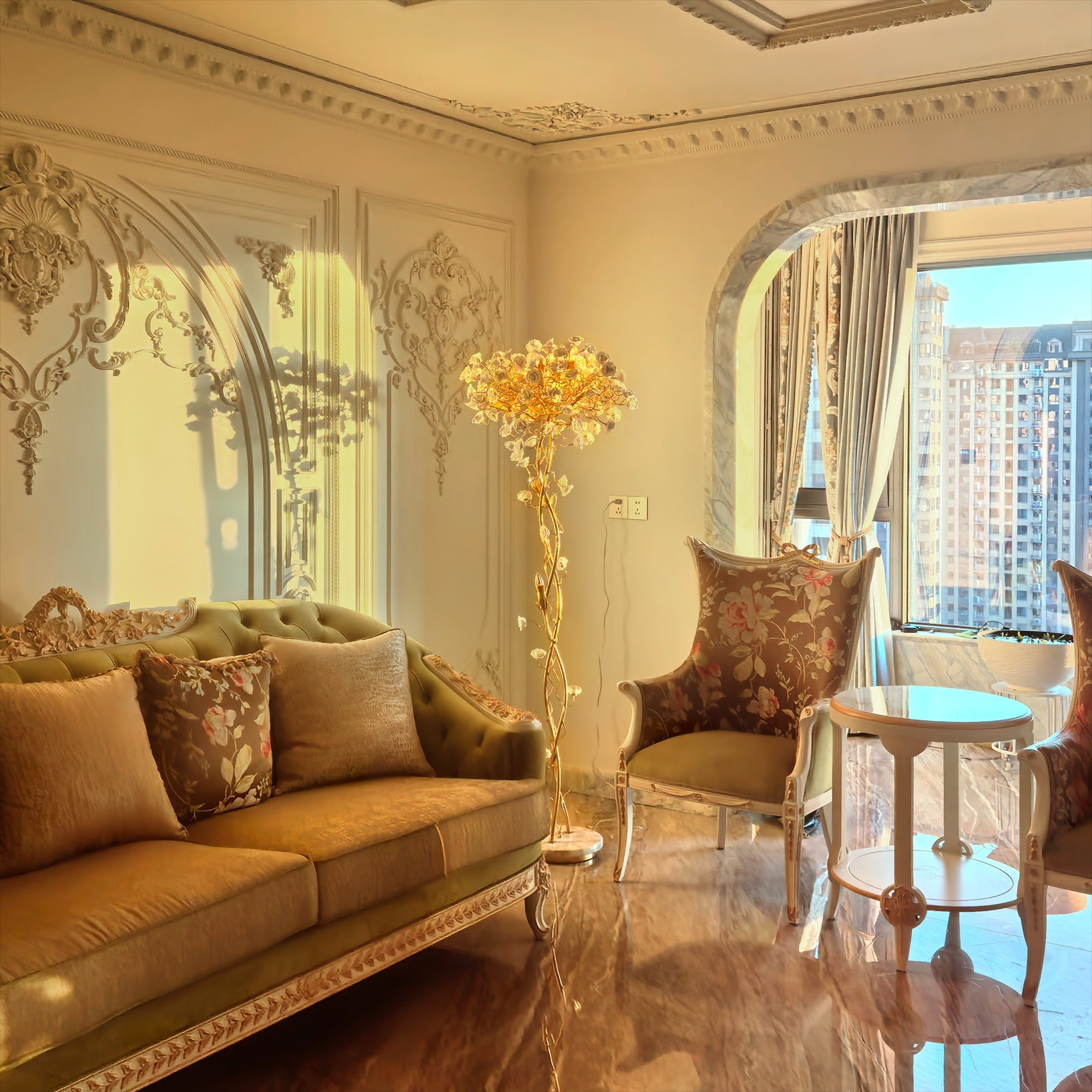 The Ceramic Flower Floor Lamp from Lia combines elegance with a touch of nature. The sculptural design features intricate ceramic flowers blooming along a twisting, gold-tone metal frame, supported by a sleek marble base. Ideal for creating a warm, inviting atmosphere, this floor lamp adds sophistication to any room with its timeless beauty and delicate craftsmanship. Perfect for spaces that require both functionality and style, it effortlessly blends into modern and classic decor alike.