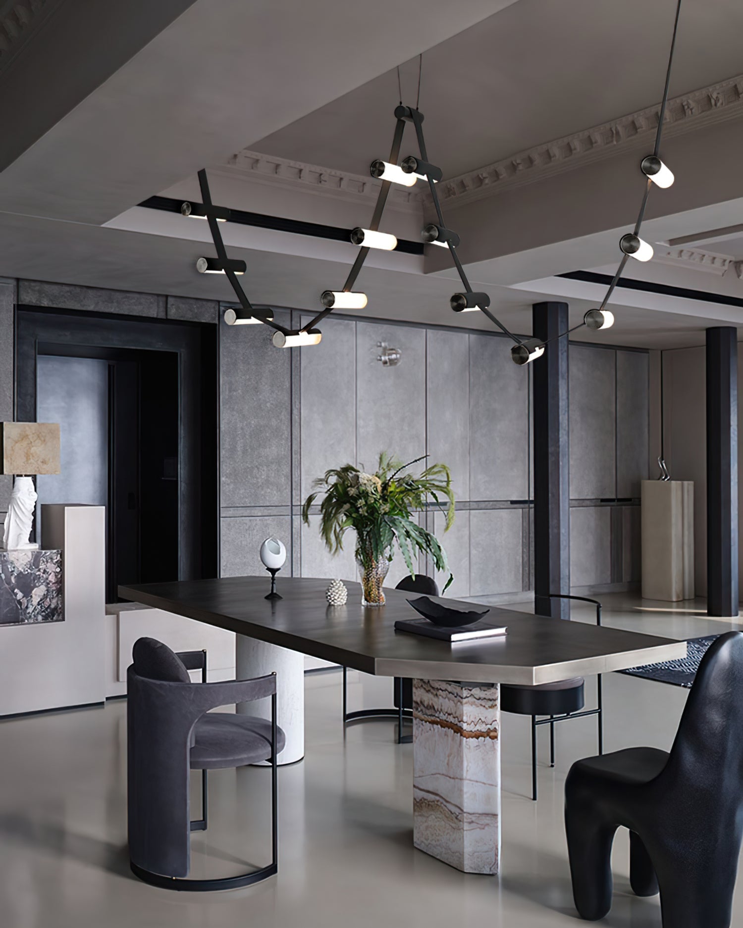 The Curve Leather Chandelier by Lia is a masterful blend of modern design and luxurious materials. This striking chandelier features a unique curved structure, elegantly crafted from premium leather and sturdy metal. The sleek, black leather elements provide a sophisticated contrast to the industrial metal components, creating a contemporary aesthetic that stands out in any setting. Perfect for dining rooms, living spaces, or modern offices, the Curve Leather Chandelier adds a touch of elegance and innovation to your decor. Illuminate your space with this exceptional piece from Lia's exclusive collection.