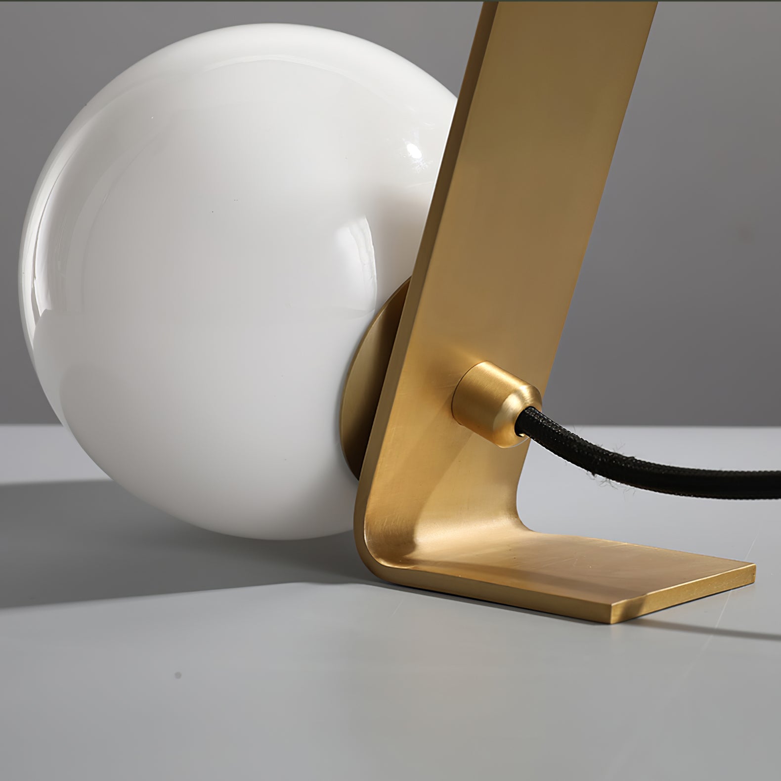 This piece has a satin brass frame made to support the structure on any table, with a milk-white round glass attached.