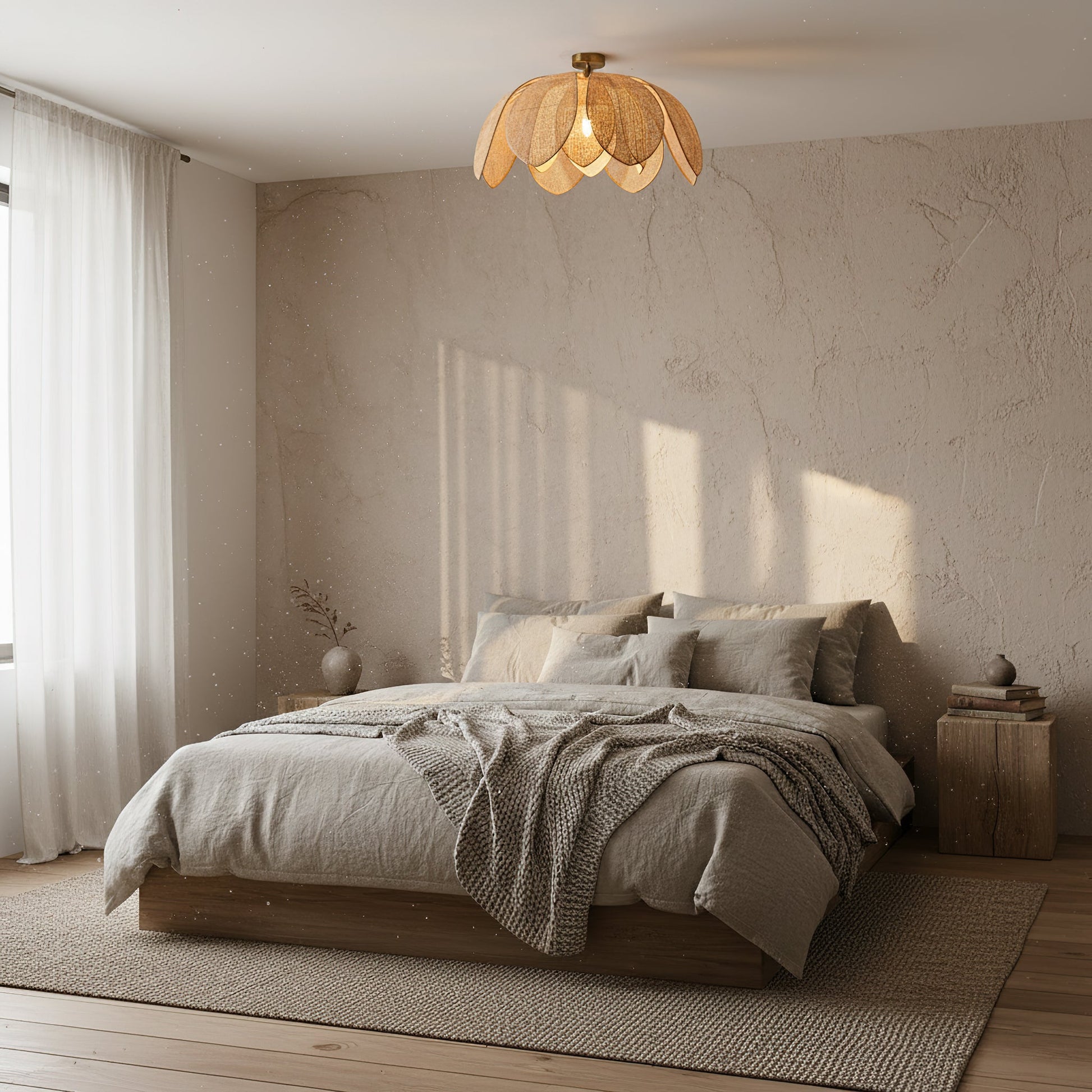 The Hanove Ceiling Light is a stunning example of organic modernism, drawing its primary inspiration from the natural world, specifically the form of a blooming flower or a lotus. It blends bohemian charm with a structured, contemporary feel, creating a fixture that is both artistic and functional. This piece celebrates the beauty of natural materials and handcrafted forms, making it a warm and inviting focal point in any space.