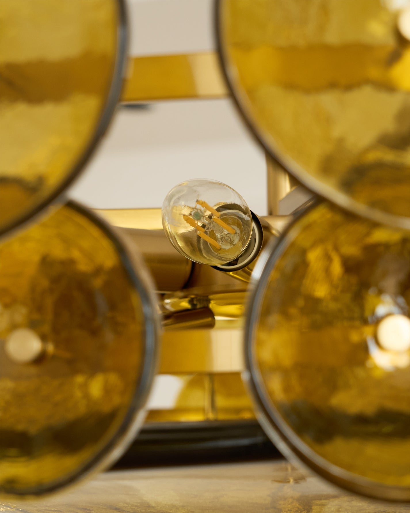 The Lorenzo Chandelier from Lia is a stunning addition to any room, radiating vintage charm with its orange-colored, circular glass discs arranged in an elegant, overlapping pattern. The warm, earthy tones of the glass bring a cozy and inviting atmosphere, while the bronze-finished metal structure adds a touch of timeless sophistication. Perfect for dining areas or living spaces, this chandelier not only illuminates but also serves as a captivating centerpiece, blending classic design with modern flair.