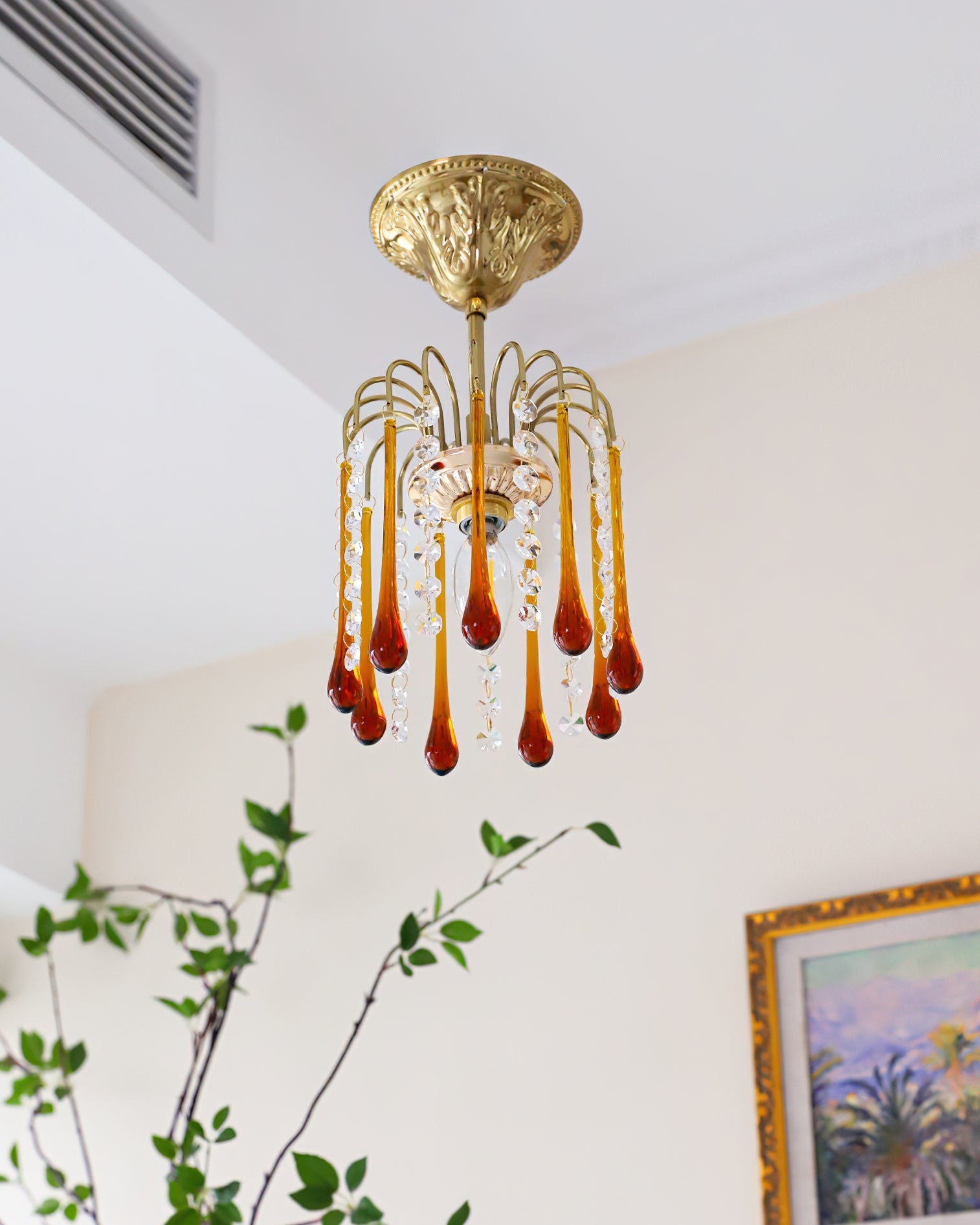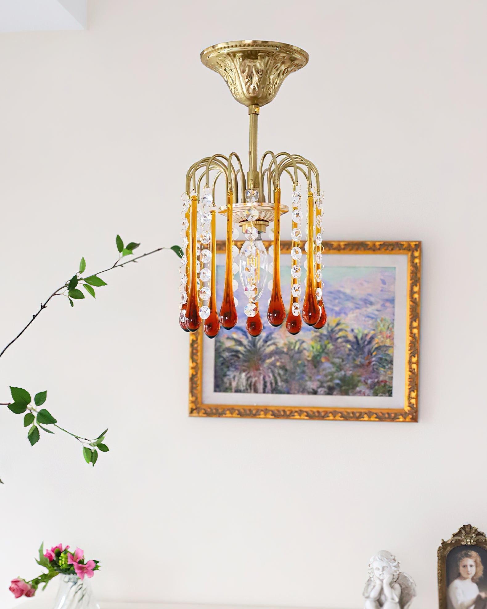 The Maltose Ceiling Light by Lia brings vintage luxury and a touch of whimsy to your space. Crafted from gold-toned metal and adorned with glistening glass droplets in rich amber and clear tones, this ceiling light creates a stunning cascade of color and light. Its ornate canopy and delicate frame lend it an antique feel, while the warm glow offers a cozy, refined ambiance.