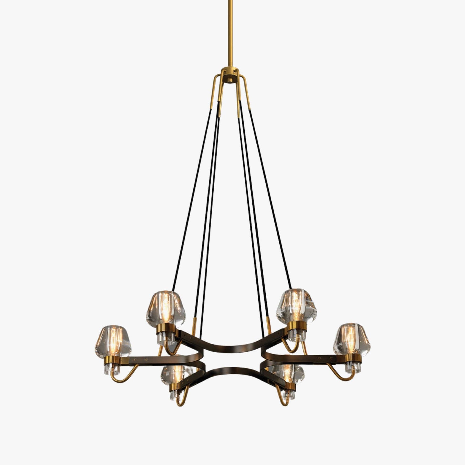 The Montalembert Chandelier is machined from solid brass. All parts are hand polished and patina. The lead crystal shades are carved and polished by hand.