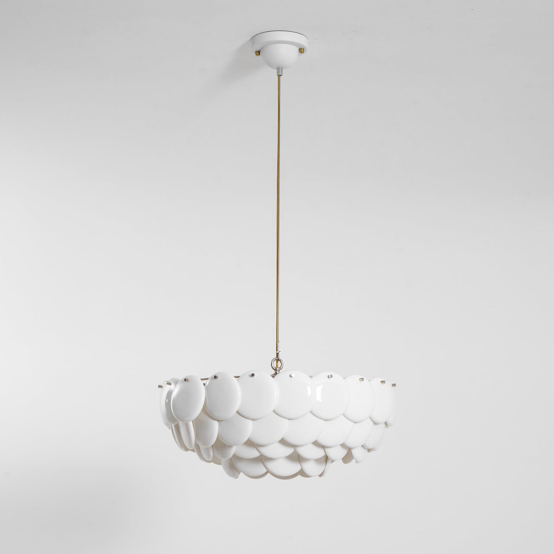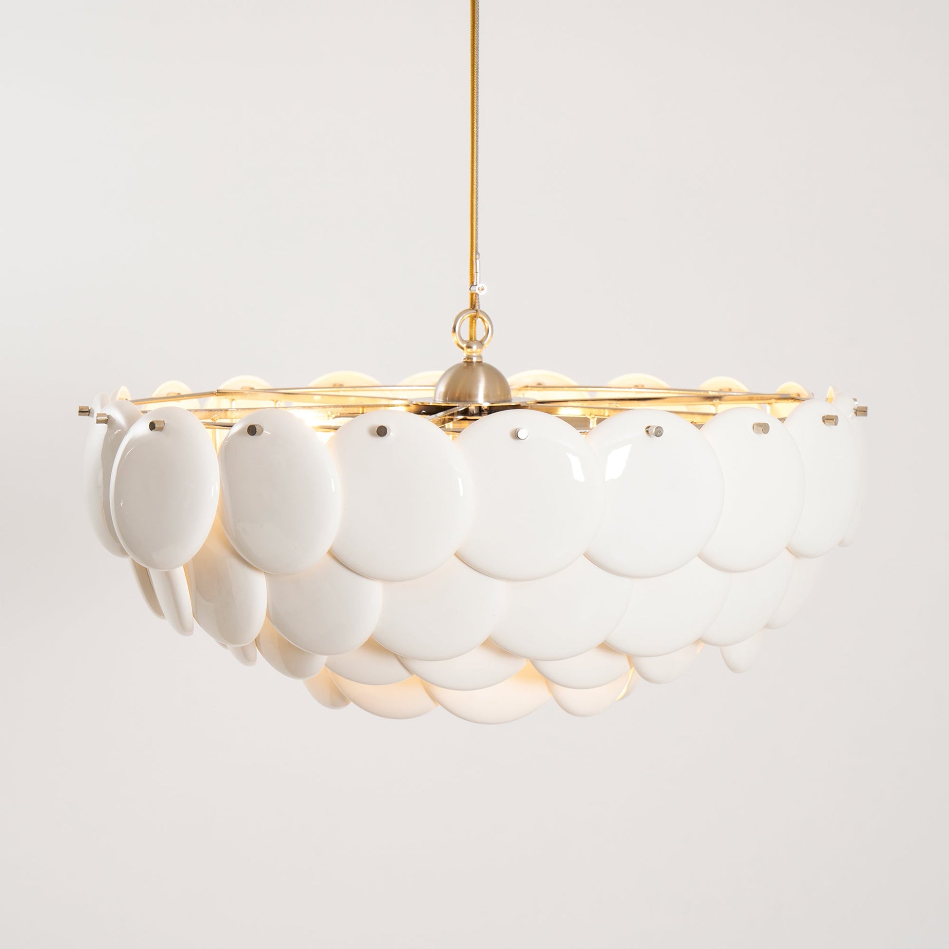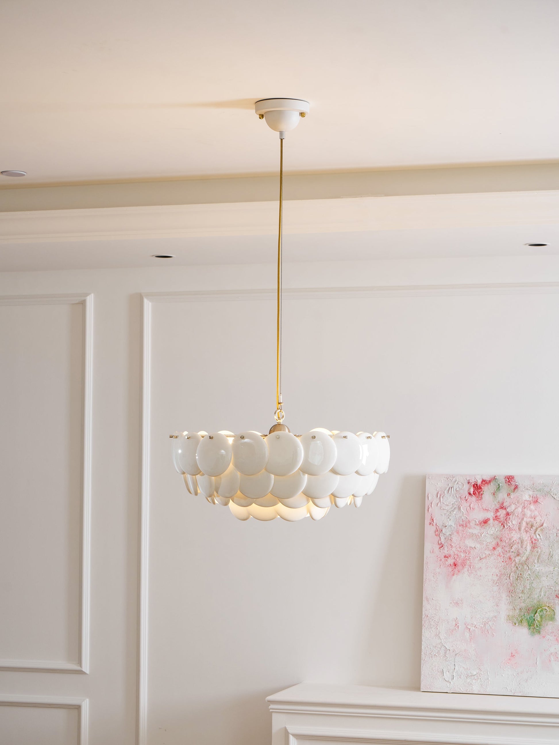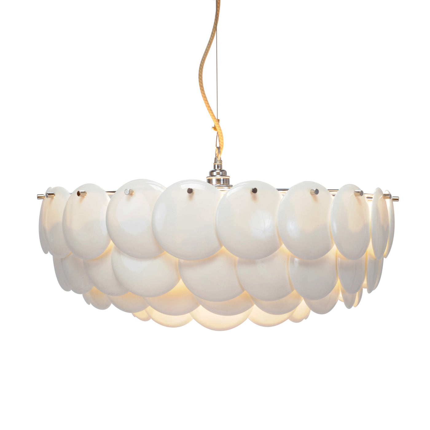 The Pembridge chandelier with its overlapping tiers of fine bone china gently diffuses light to create a soft, atmospheric glow. With an open top and bottom, the Pembridge throws light up as well as down, creating beautiful effects of shadow and light.