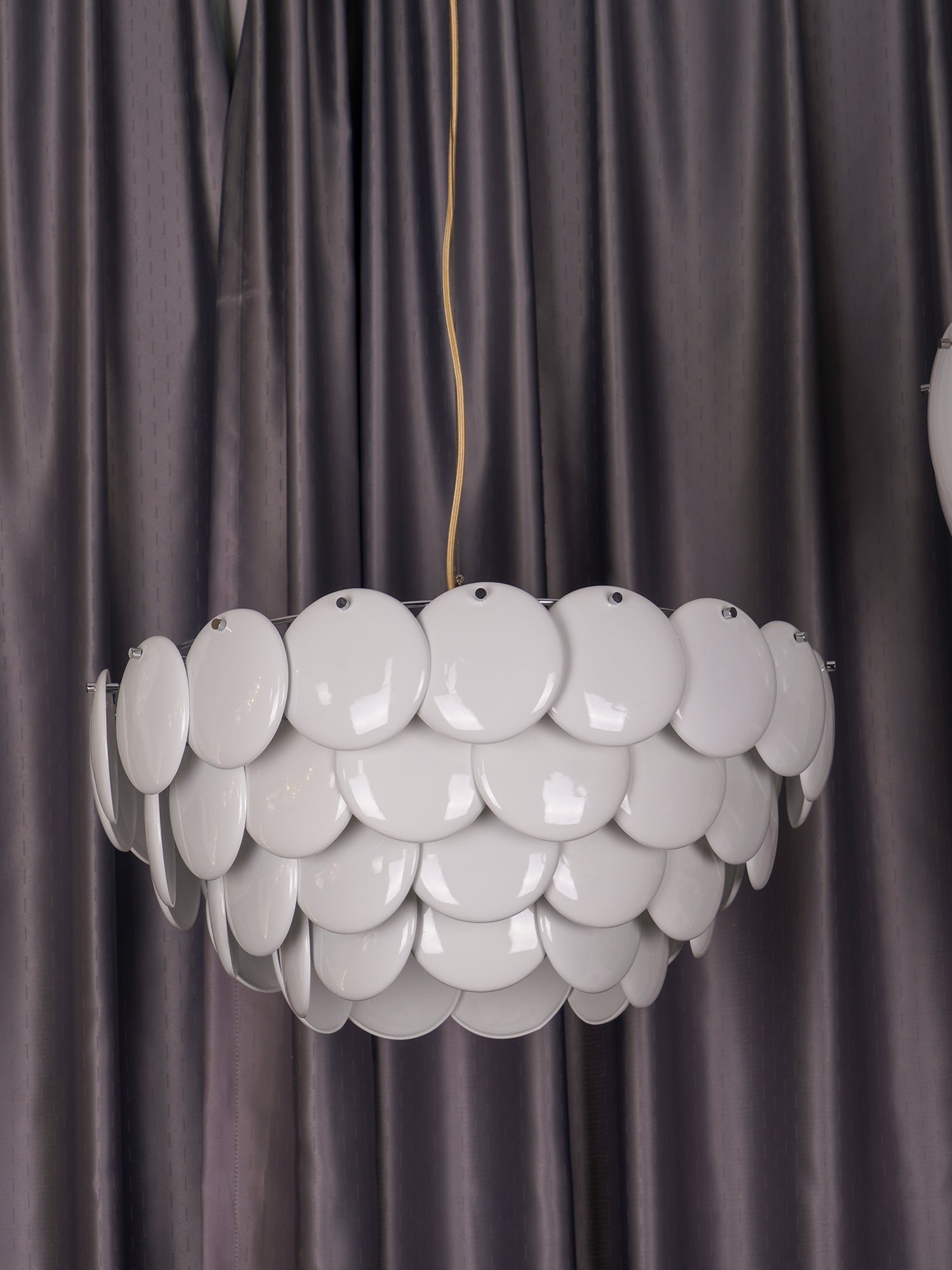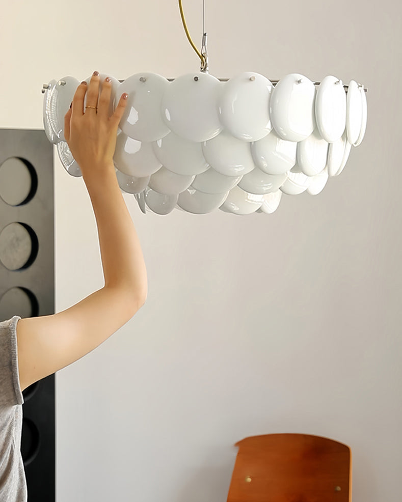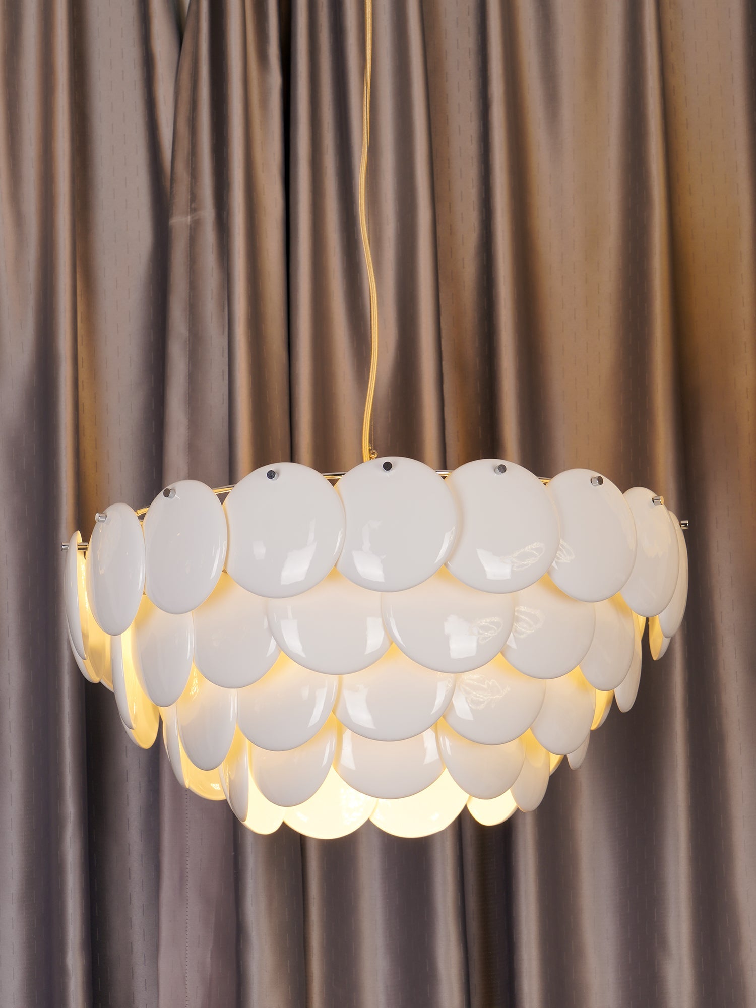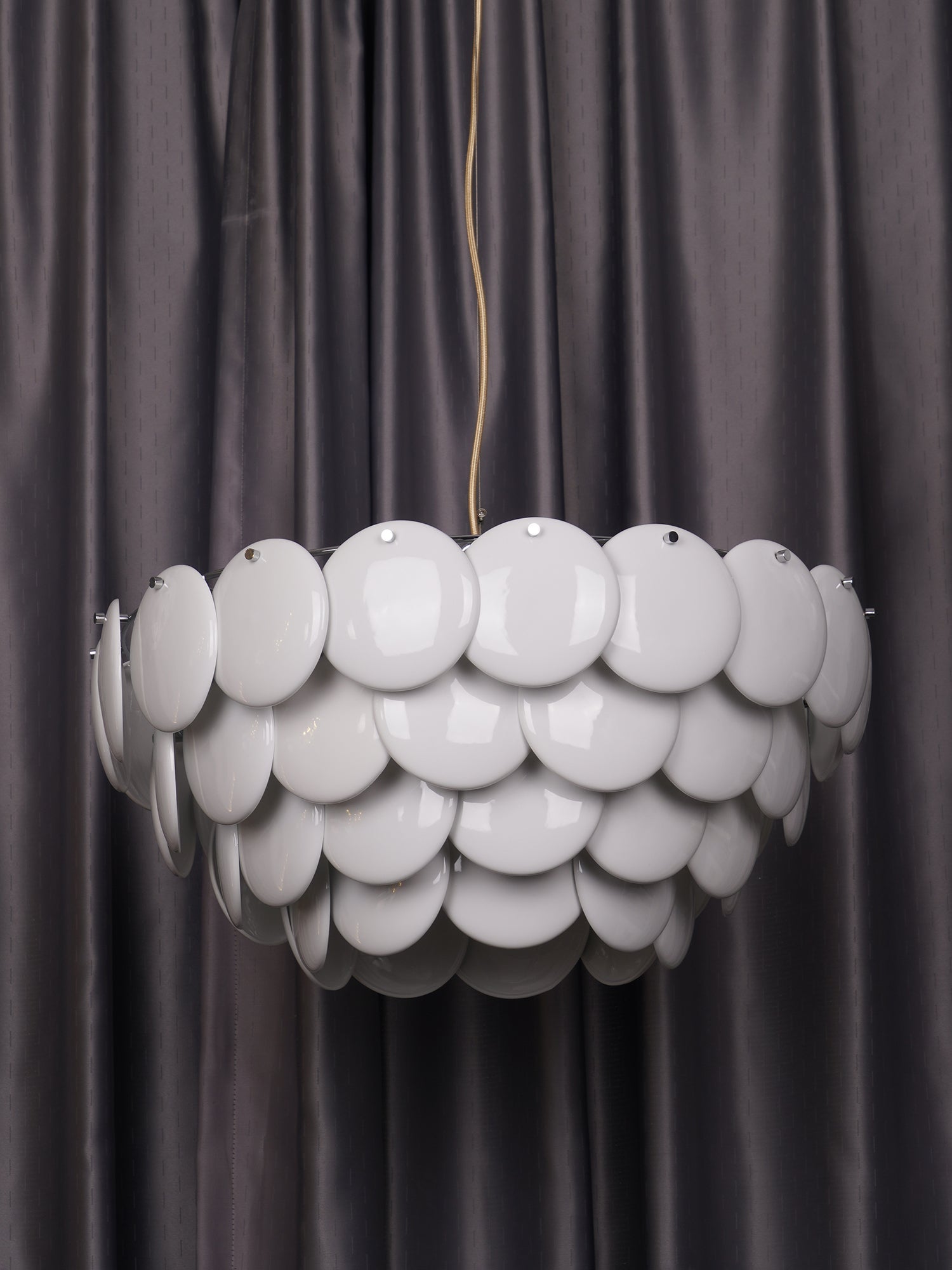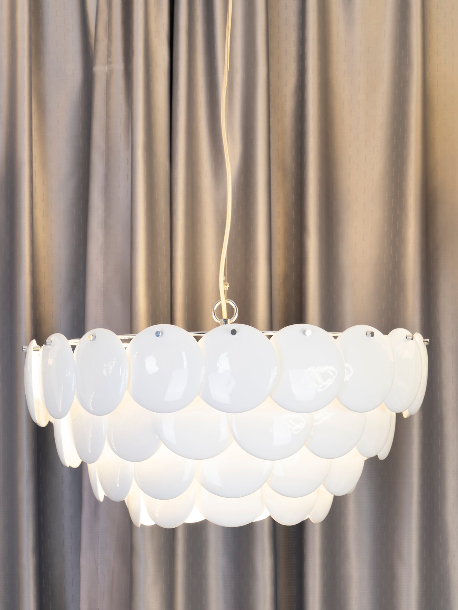 The Pembridge chandelier with its overlapping tiers of fine bone china gently diffuses light to create a soft, atmospheric glow. With an open top and bottom, the Pembridge throws light up as well as down, creating beautiful effects of shadow and light.