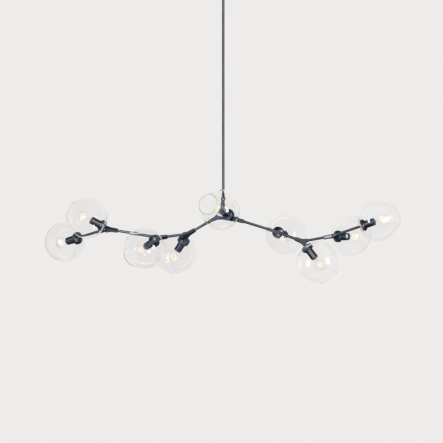 The design showcases an array of clear glass globes, each delicately suspended, creating a stunning visual display that captures the eye. The glass globes are arranged in a horizontal configuration, allowing for an even distribution of light that adds warmth and brilliance to any room.
