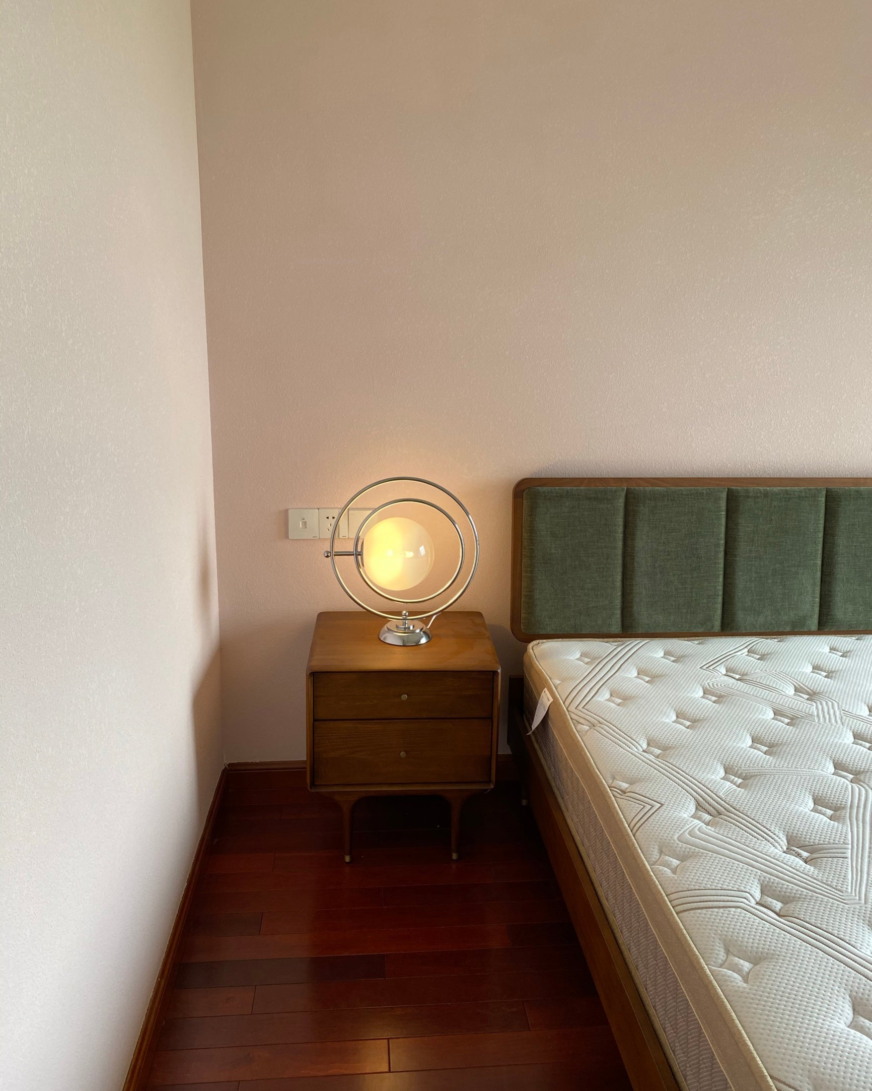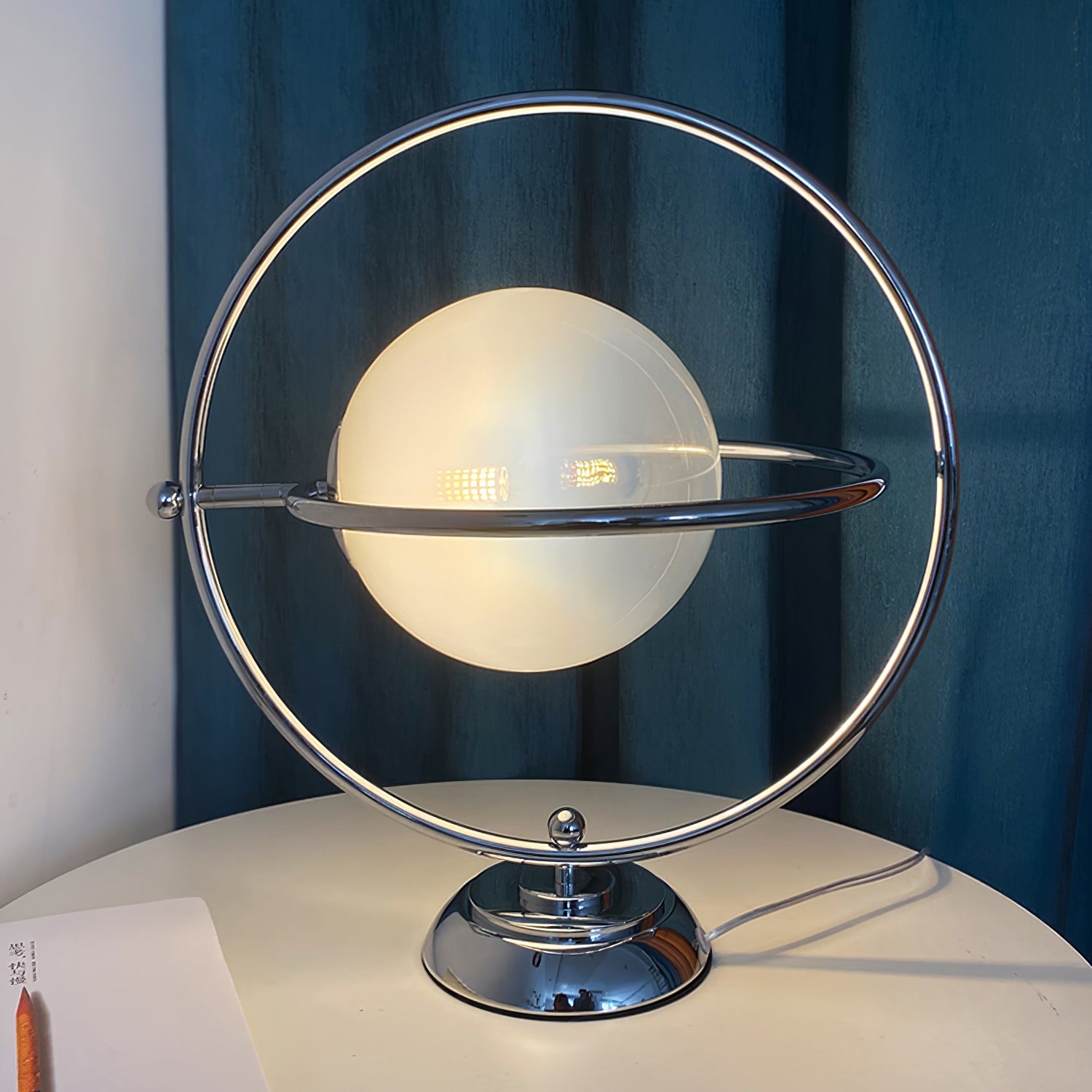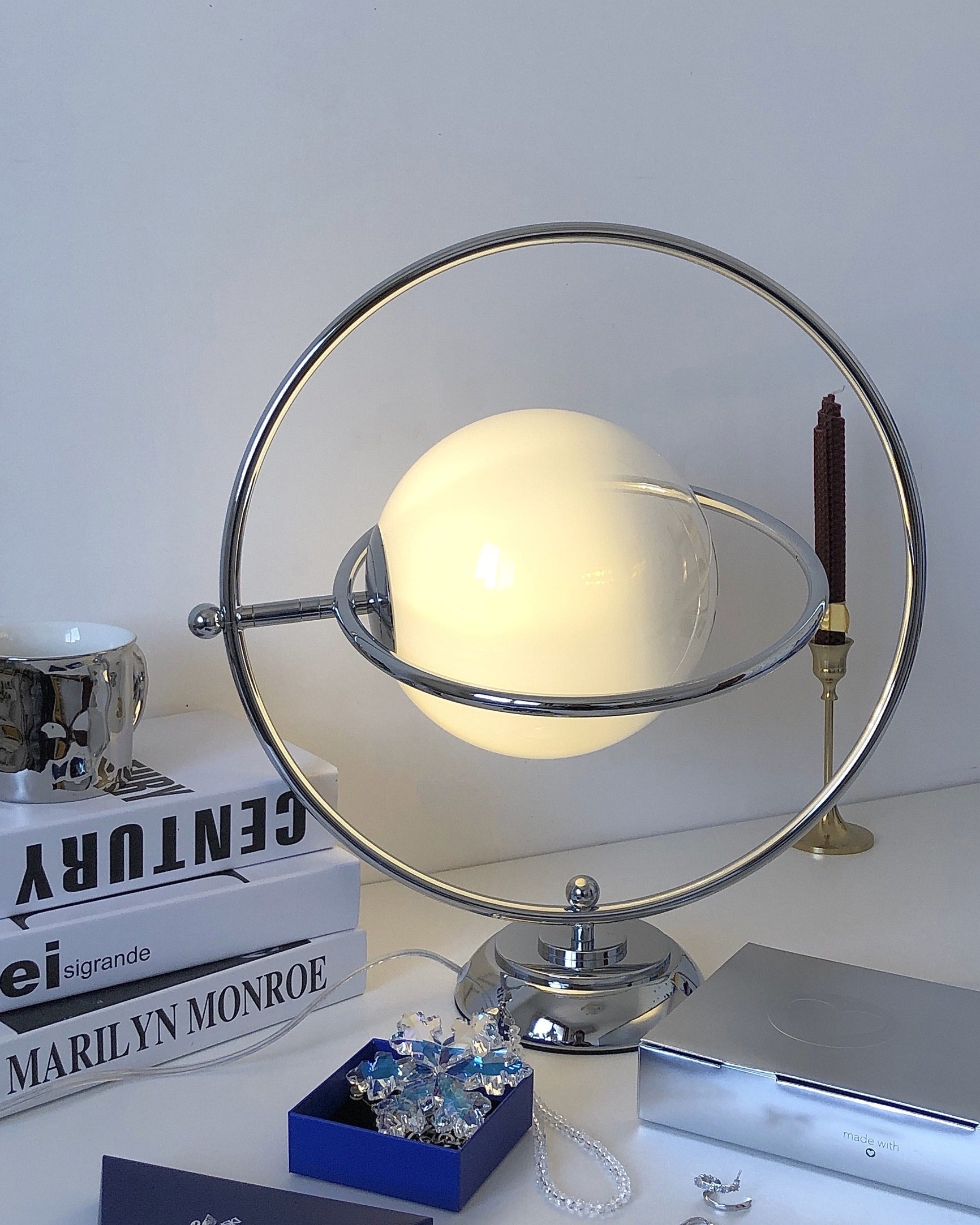 Inspired by the first phase of space exploration, the design aesthetic of the space age was born in an age of technological and economic development. The rotating planet table lamp shows us a whimsical design, like a hanging moon, with a metal ring and base, the ring orbit can be rotated 360 degrees, practical and interesting.