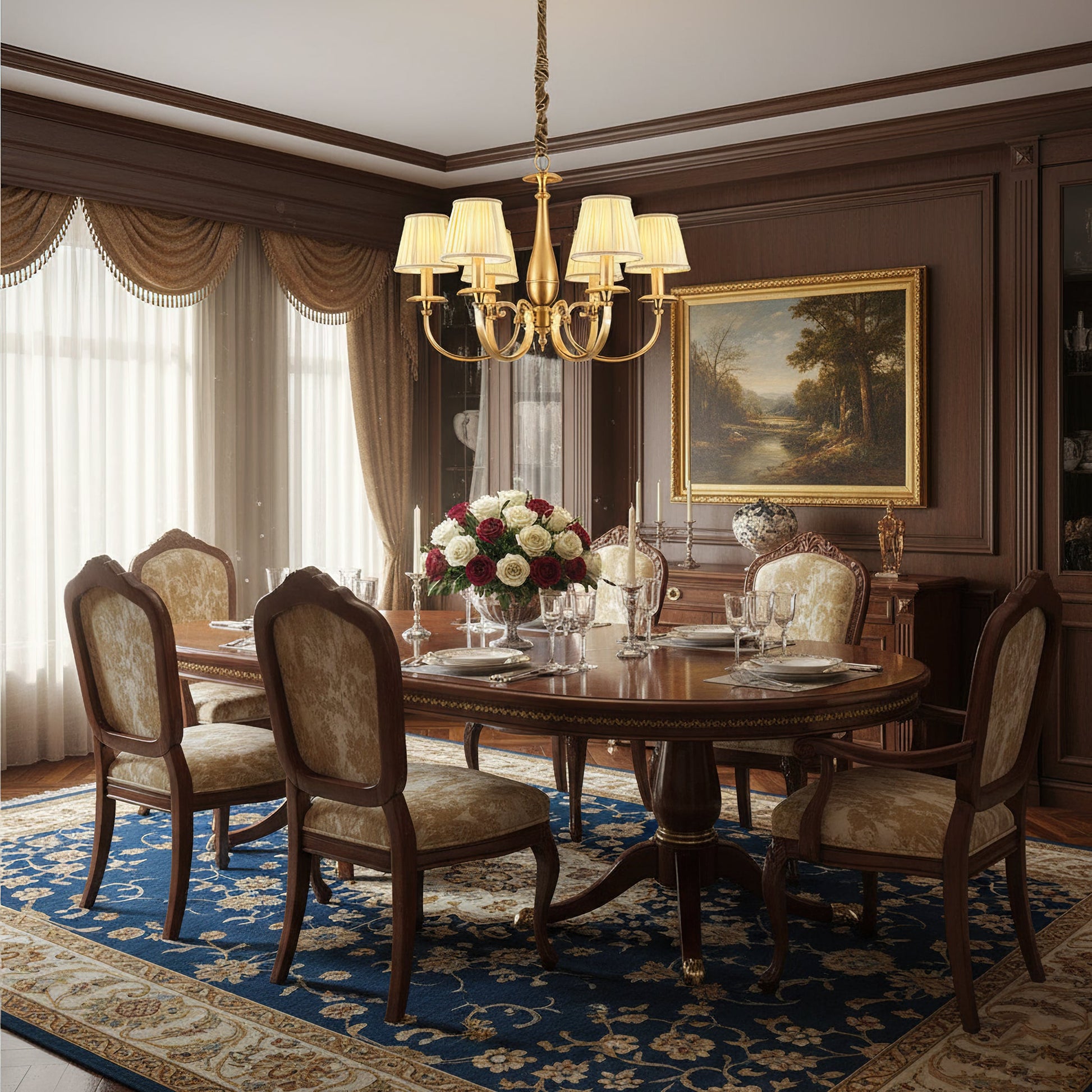The elegant Pleated Brass Chandelier from the antique brass range has beautifully curved arms and simple clean detailing. It's complemented by pretty, White fabric effect shades. The Pleated Brass Chandelier is a premium quality, solid brass fitting in a Georgian style with a decorative detailed finish. Comes with pretty, pleated White fabric effect shades.