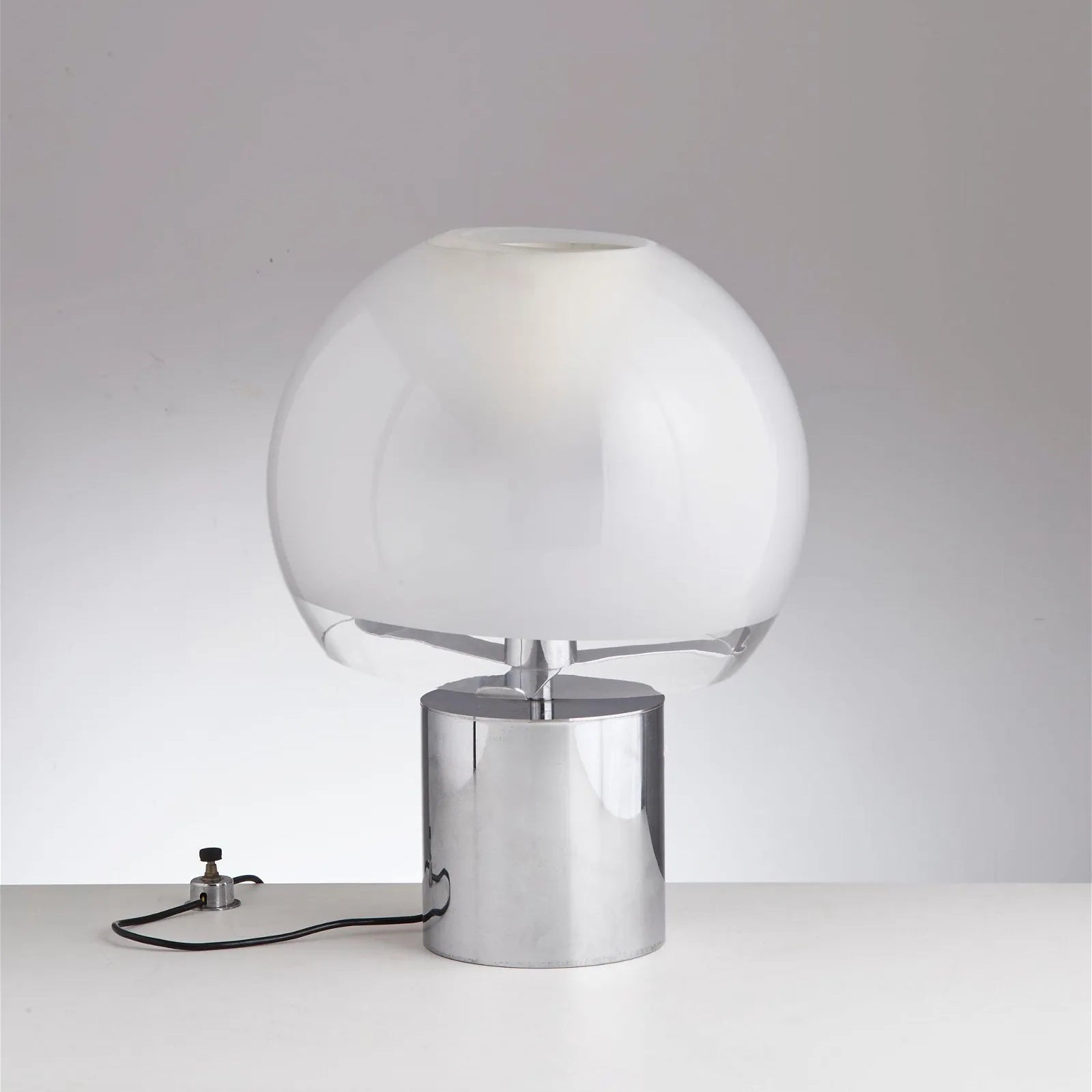 Its design is reminiscent to the designs typical for Space Age of the late 1960s. The orb is largely executed in frosted glass and the lower segment is executed in clear glass, that in combination with the round opening makes a bright light partition. The round base creates an eccentric combination with the glass orb.