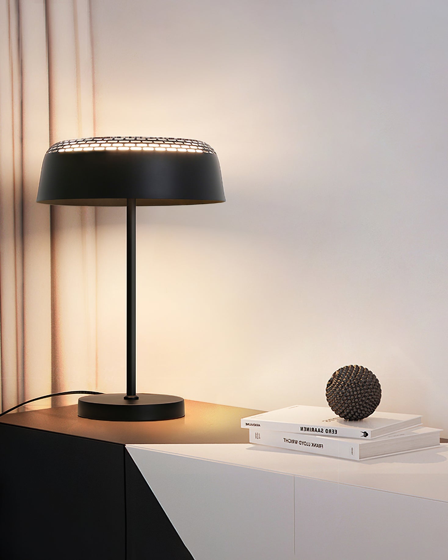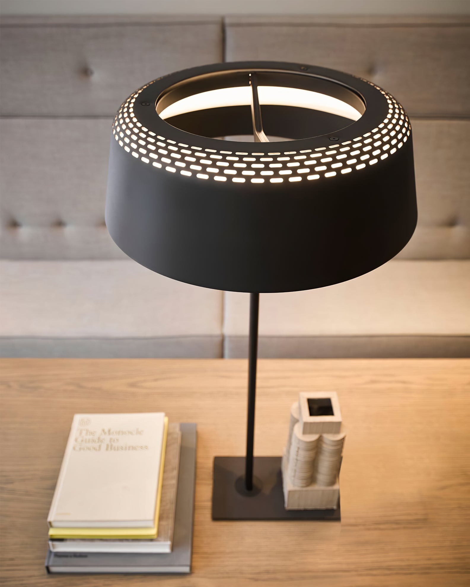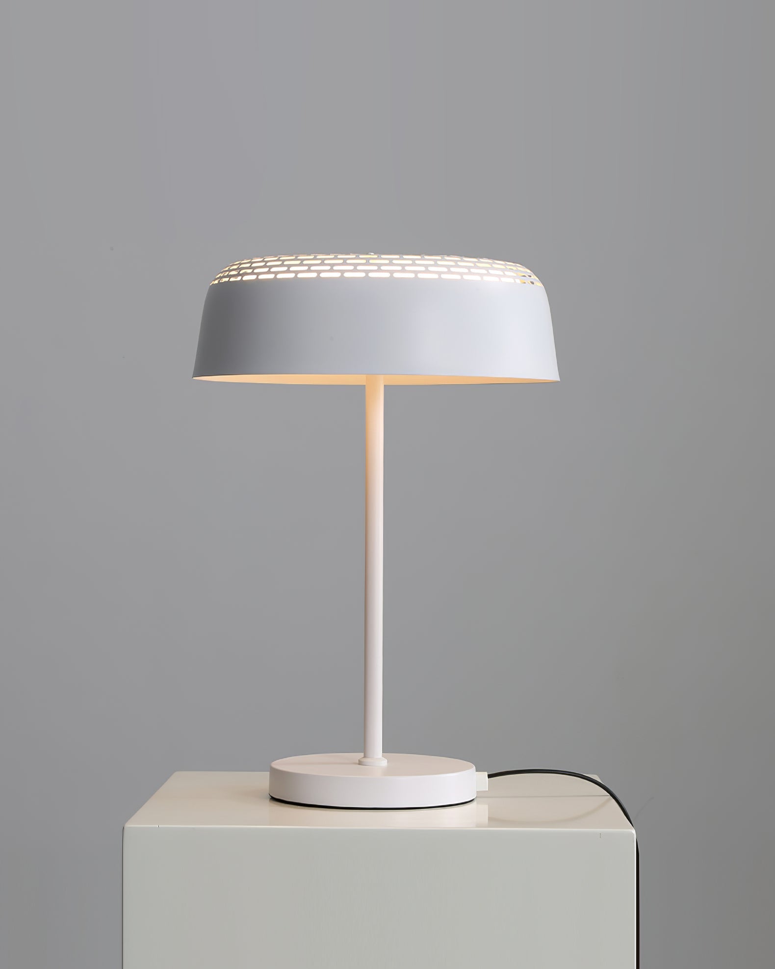 The perforations in the steel offer a subtle decorative effect and also allow the light to be transmitted. The pattern on the shade is characteristic of the design. Ring is an understated table light with unique details which makes it widely applicable in a variety of interiors.