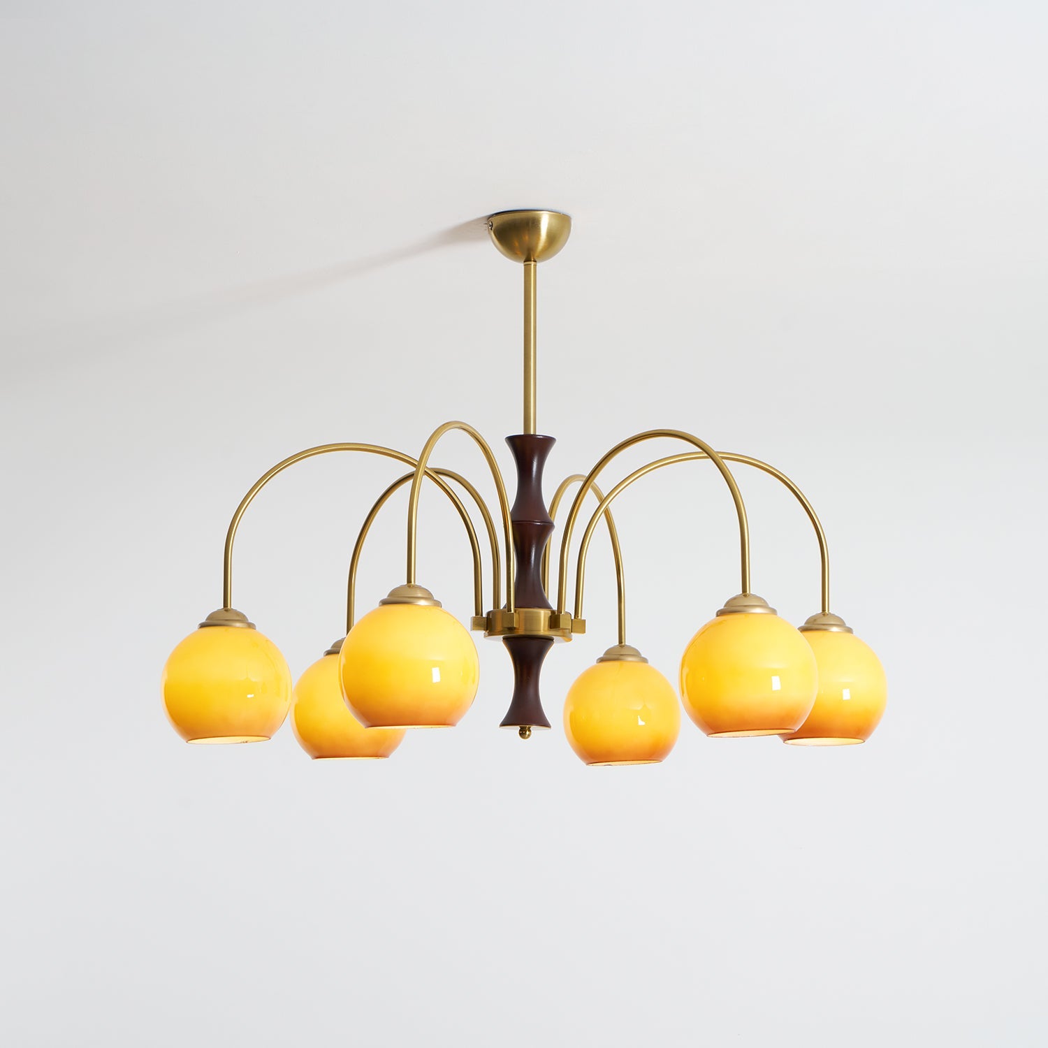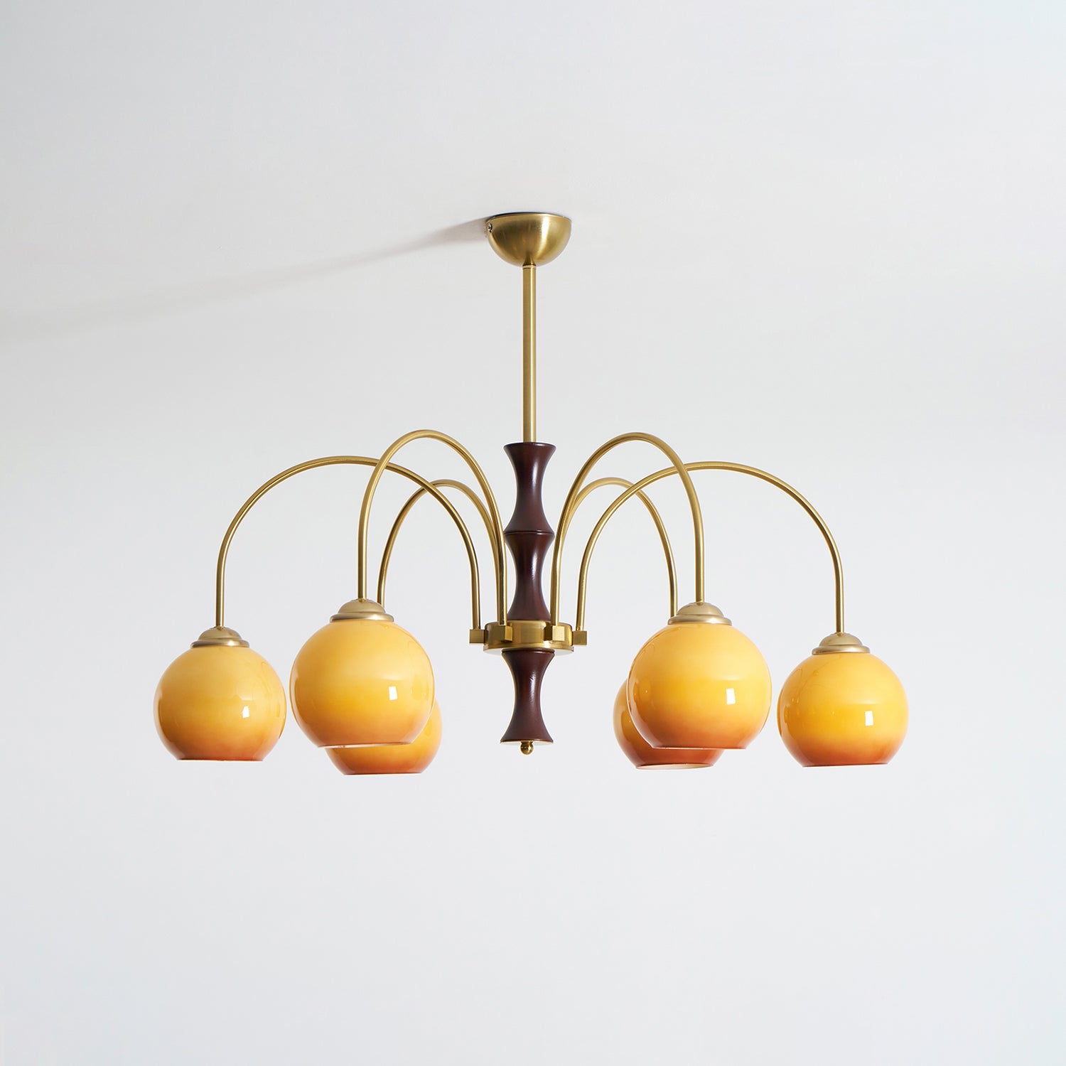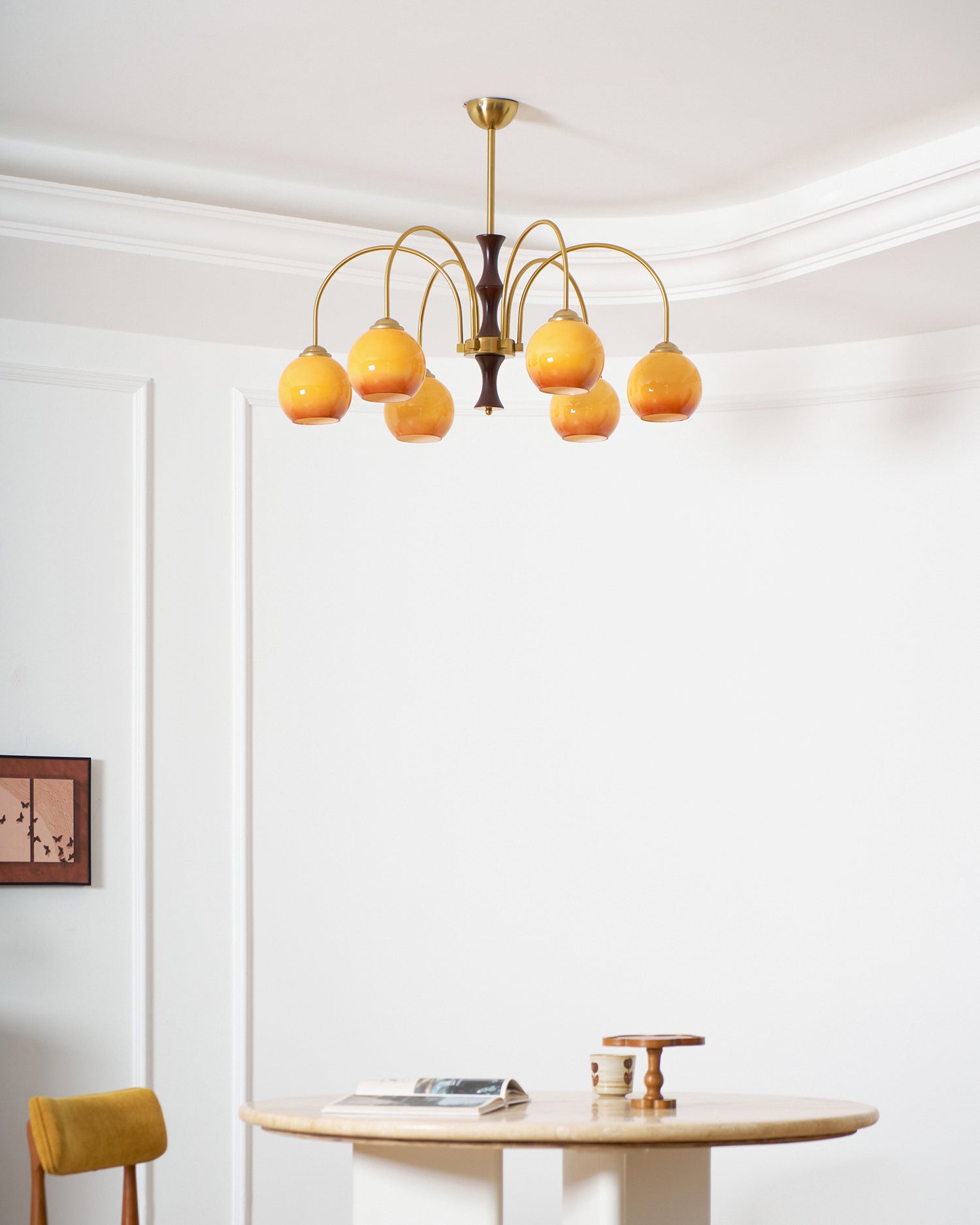 This is a beautifully crafted satellite ball chandelier made of metal, glass, and wood. The chandelier combines vintage and modern styles, with its polished metal rod providing a sleek and elegant structure. The five spherical glass shades transition from a deep orange to a light yellow, creating a warm and soft glow. The wooden central accent adds a natural element, enhancing the overall design with depth and uniqueness. This chandelier is not only functional but also adds a touch of artistry to any interior space.
