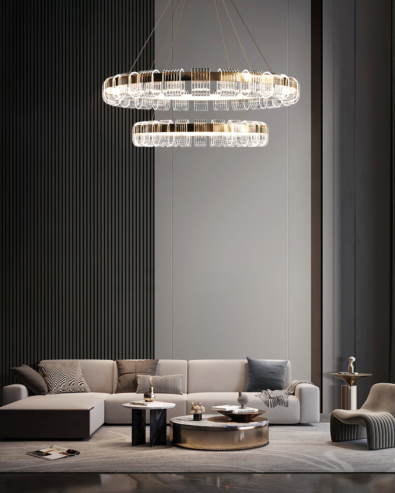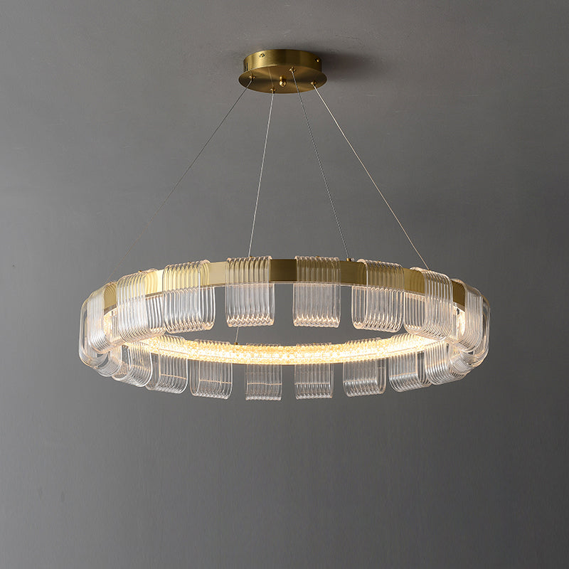Saturno LED Chandelier features a stunning track design that brings a wide, lasting appeal to open spaces. A low-profile canopy retains this Italian-made fixture, extending a series of slender cables to a wide horizontal loop. The outside of this ring is fitted with LED lights to reduce glare. A set of stacked tetrahedral acrylics act as lampshades. These wonderful facets bring gem-like appeal as they sparkle with highlights that radiate their surroundings and even light.
