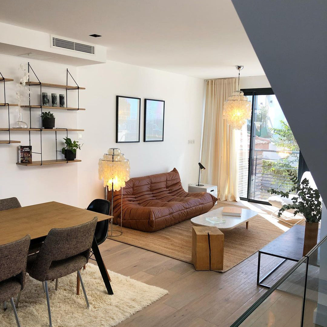 Seashells Floor Lamp is made of natural mother of pearl shells that are held to the highest quality standards and hung on stainless steel rings. The fixture has a sense of movement and life. When there is a light breeze, or you open your door, a beautiful sound is created from the shells knocking gently against each other.