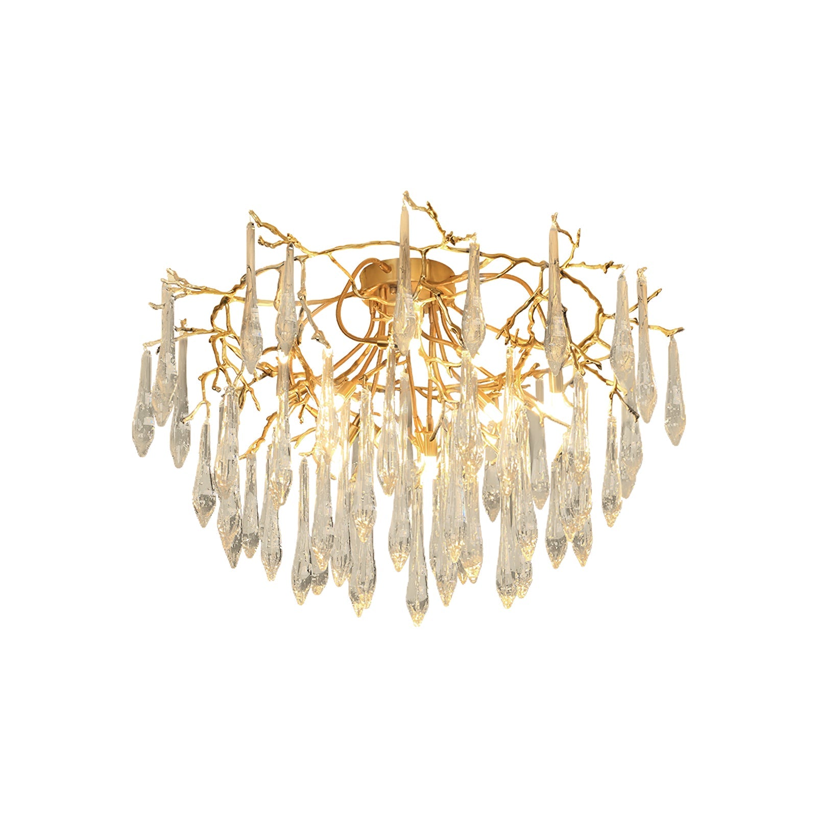A mesmerizing statement that will inspire awe from above, the fitting features organically formed brass branches dripping with teardrop shapes of handblown glass. Crafted so that it plays with light in an enchanting manner, the ceiling lamp would command attention in a contemporary space.