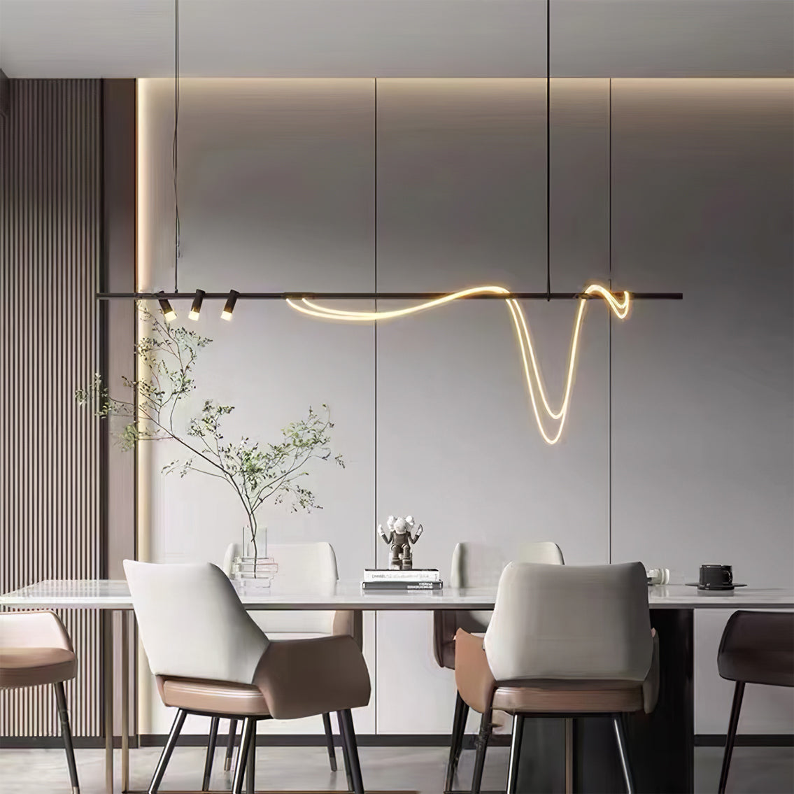 Immerse your space in the modern elegance of the Tracer Chandelier. Its distinctive curved lines create a dynamic and fluid silhouette, capturing the essence of sophistication and ushering in an era of elevated illumination. Whether suspended above a dining area or making a statement in an office the Tracer Chandelier is a captivating fusion of form and function.