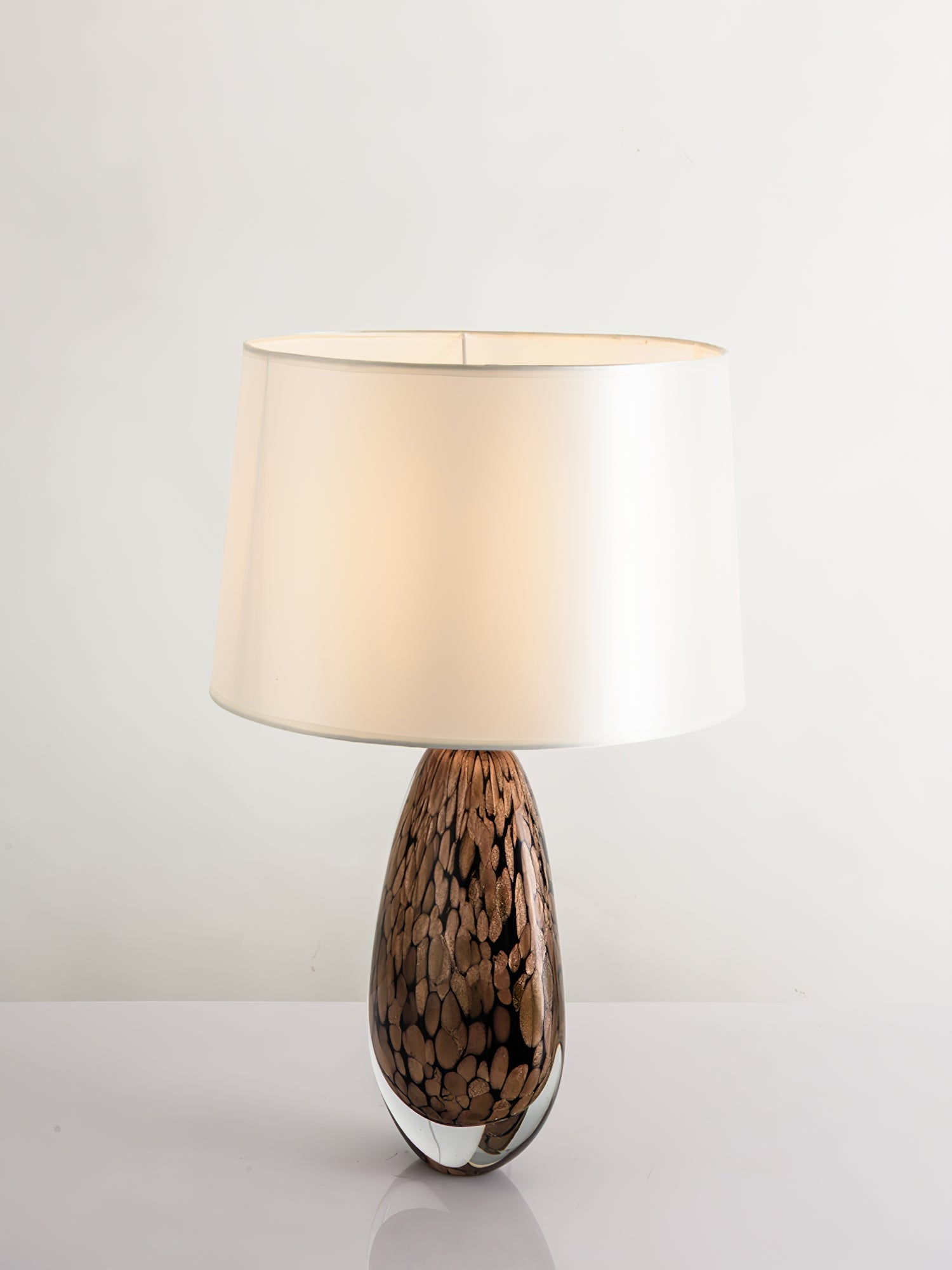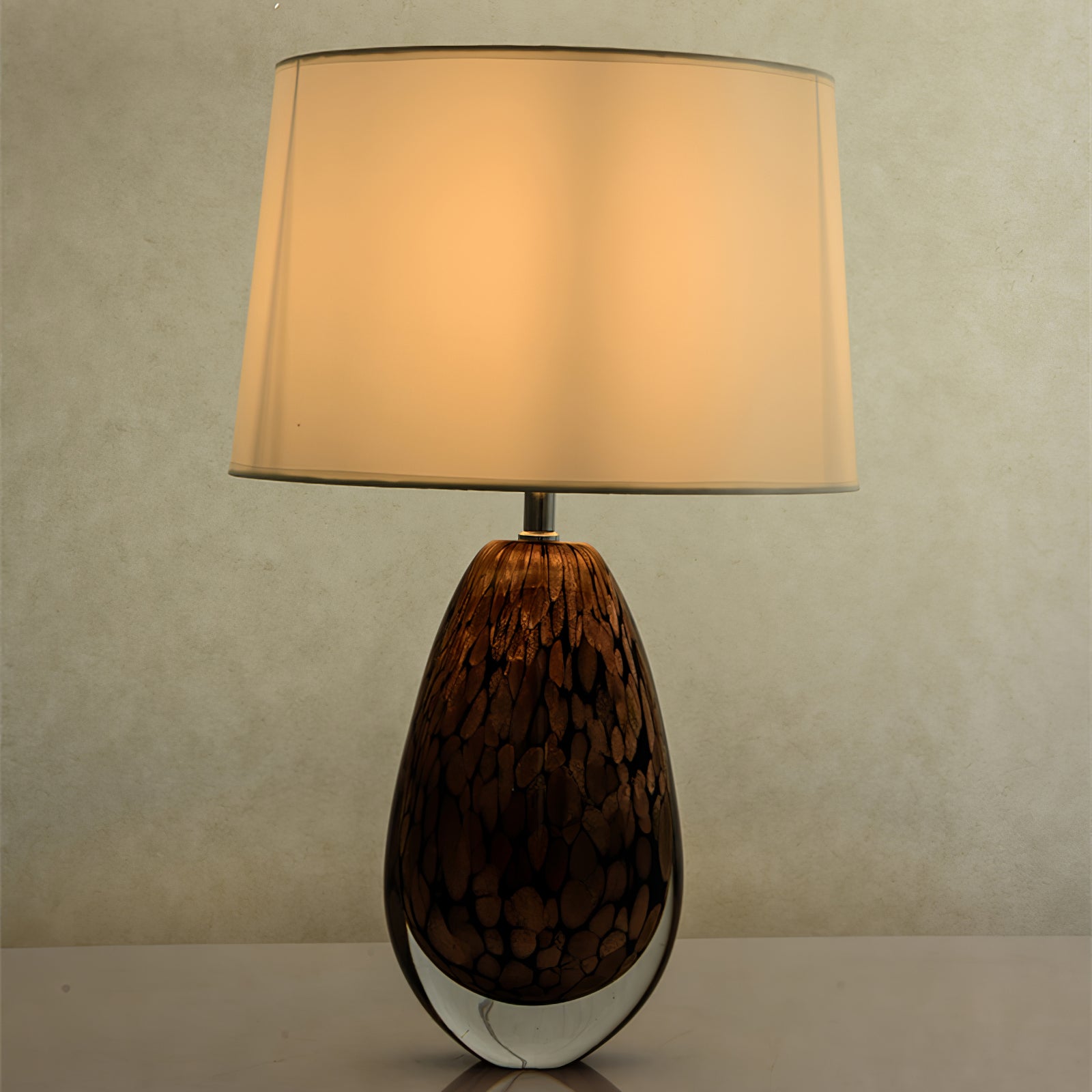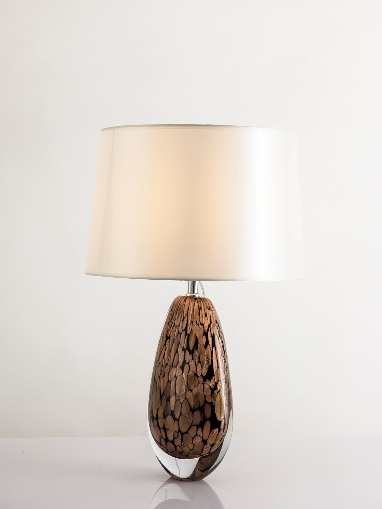 The glass surface of our Tullia Table Lamp seems to be swirling with a storm of black and metallic copper hues, the implied movement giving this lamp a powerful presence.